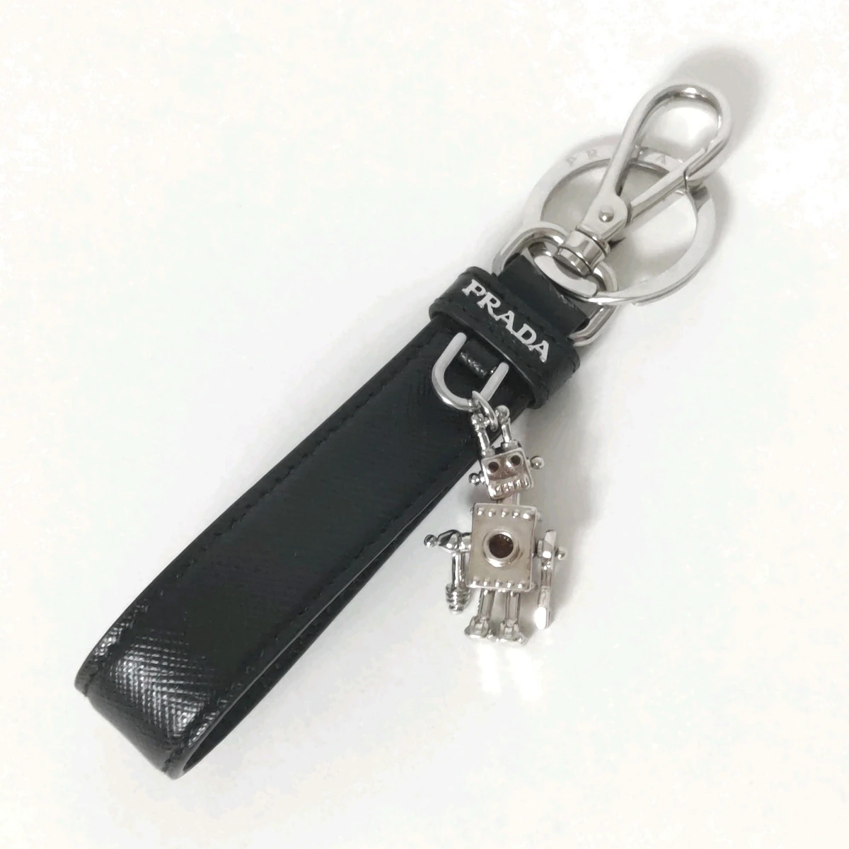 Experience luxury and style with this PRADA Bag Charm. Crafted with black, silver, and red leather, it features elegant hardware and sparkling rhinestones. The perfect accessory to add a touch of glamour to your bag. Measurements of 5.51 inches in height and 0.79 inches in width make it a versatile addition to any bag. Elevate your look with this must-have charm!