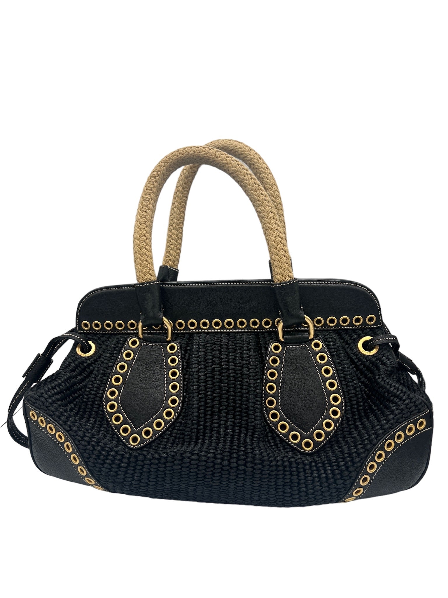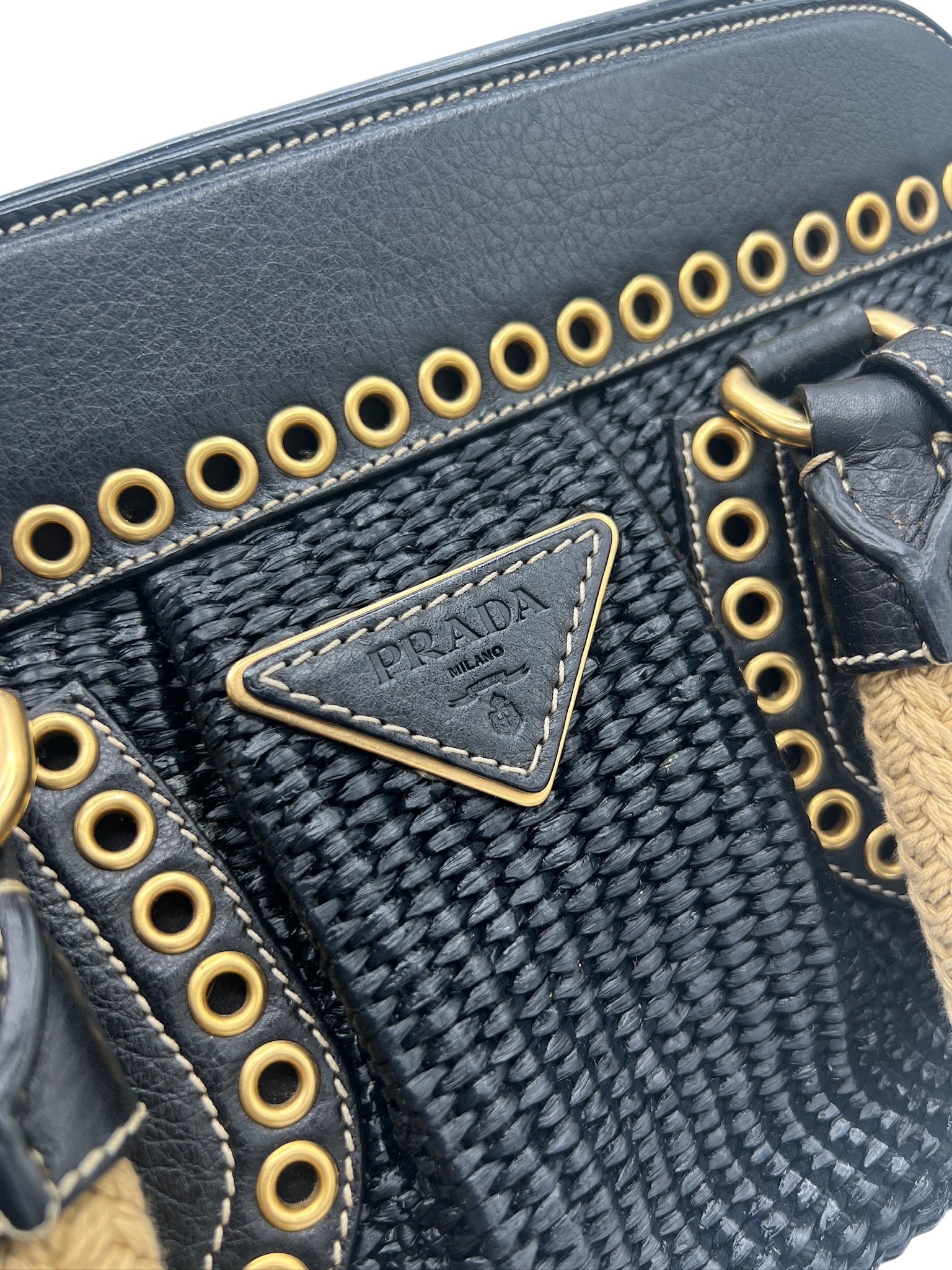 The of the product has been verified by entrupy so you can shop confidently knowing that you are getting an item from us! Add some flair into your wardrobe today by purchasing our PRADA Black Beige Straw Leather Handbag!