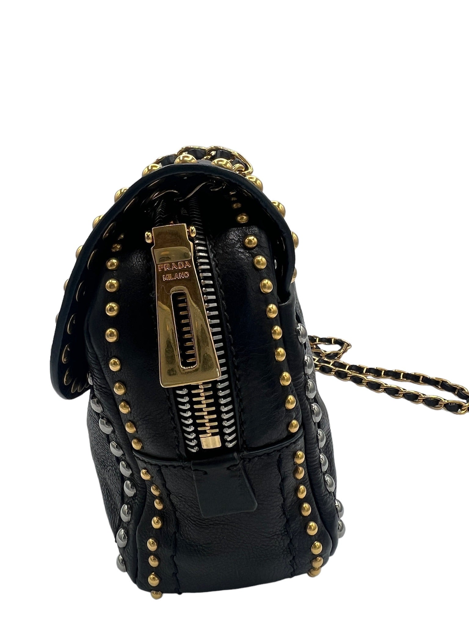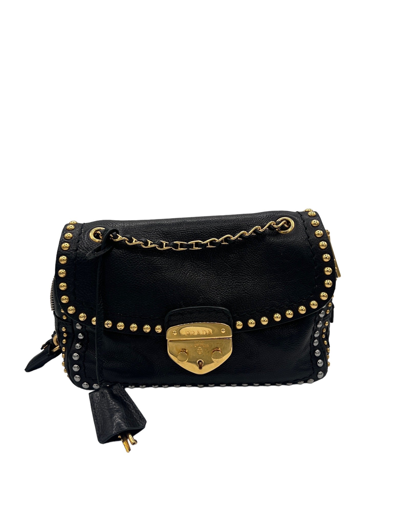 PRADA - Black Glace Calf Studded Pushlock Chain Shoulder Bag