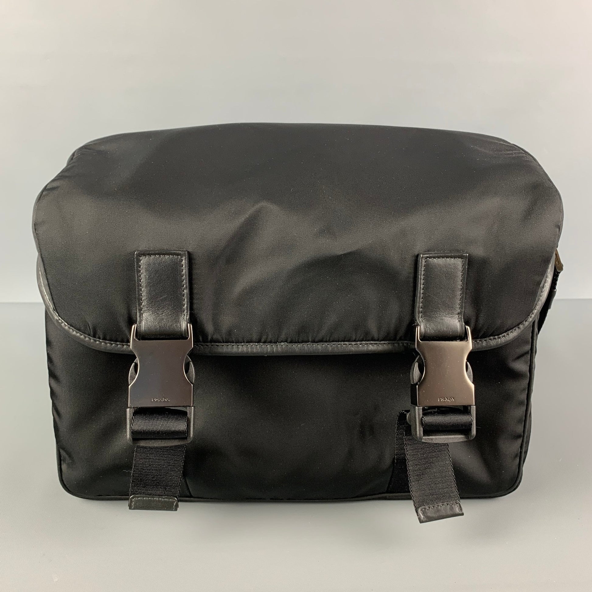 PRADA bag comes in a black nylon with a leather trim featuring a adjustable crossbody strap, dual compartment, back pocket, side pocket, logo emblem, and a front double buckle closure. Includes s.