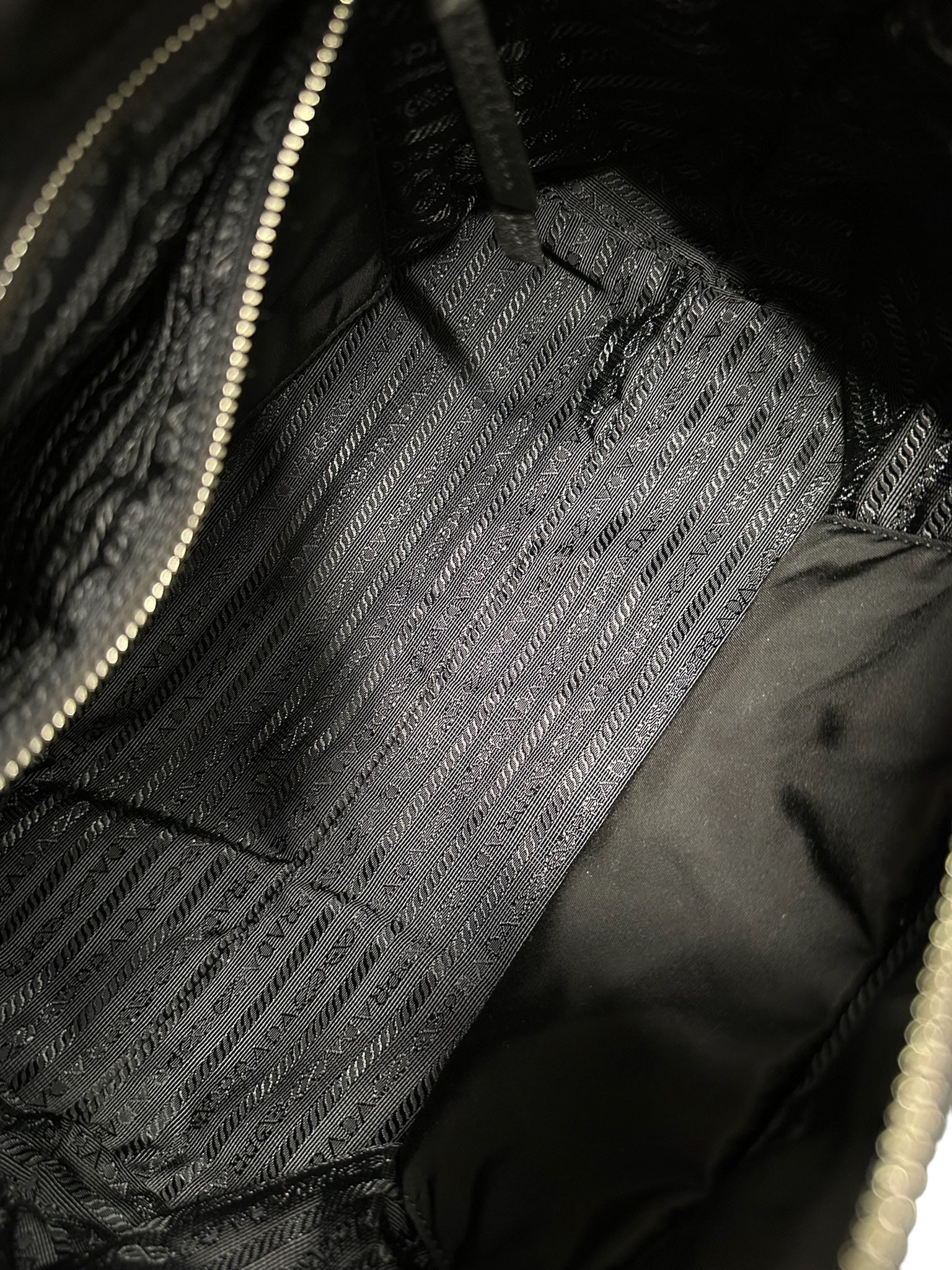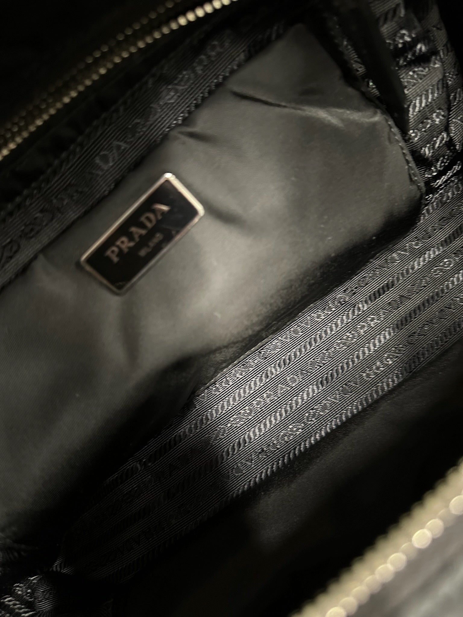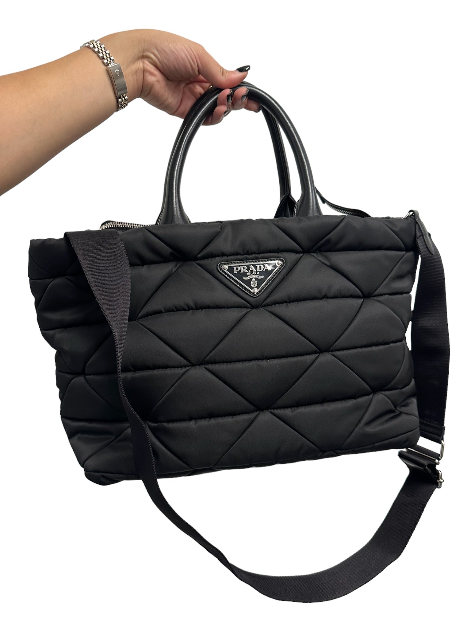 Elevate your style with the PRADA Black Re-Nylon Medium Padded Tote. Featuring sleek silver toned hardware, this tote is both functional and fashionable. Made from recycled materials, it's a guilt-free way to make a statement and help the planet. A perfect blend of luxury and sustainability.