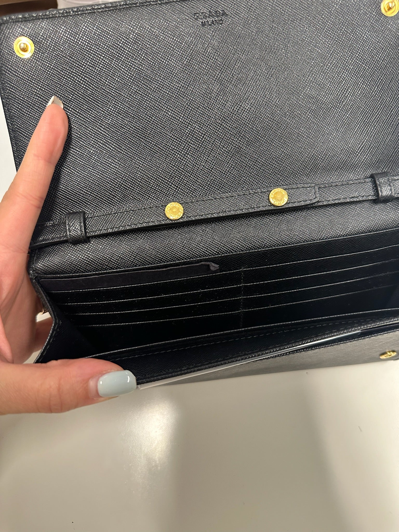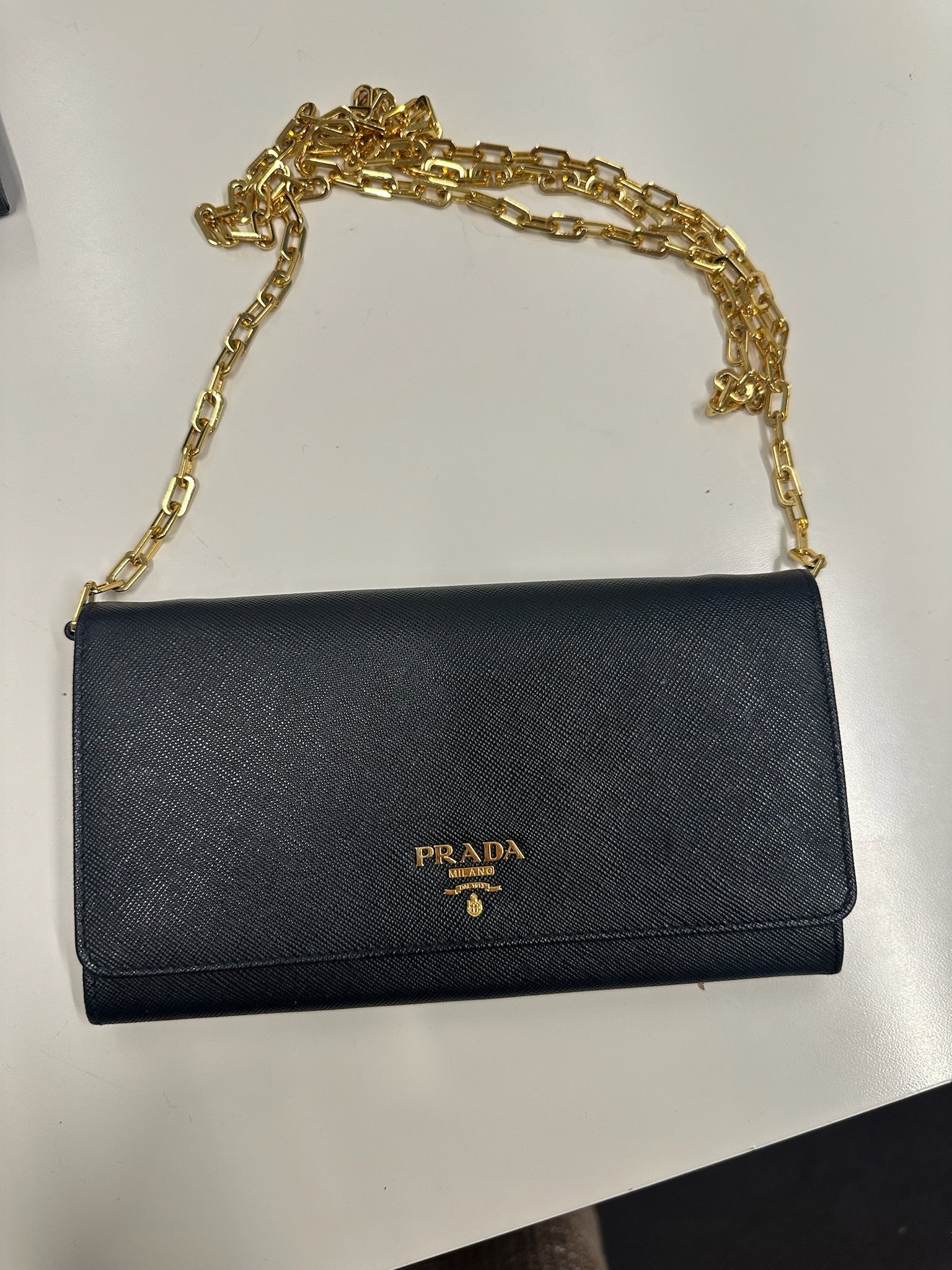 Elevate your style with the PRADA - Black Saffiano WOC. Adorned with golden toned hardware, this chic accessory adds a touch of sophistication to any outfit. Make a statement and command attention with this must-have piece from PRADA.
