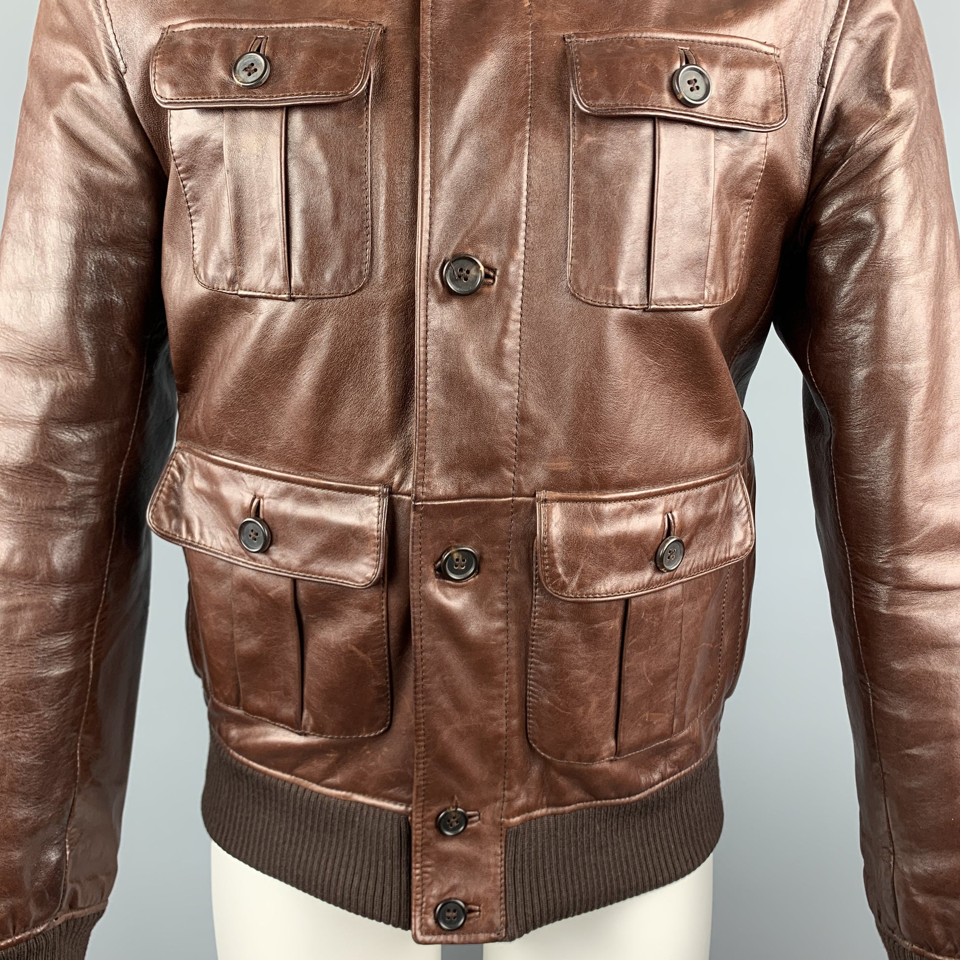 PRADA Chest Size 40 Brown Leather High Collar Epaullettes Zip & Buttons Patch Pockets Jacket