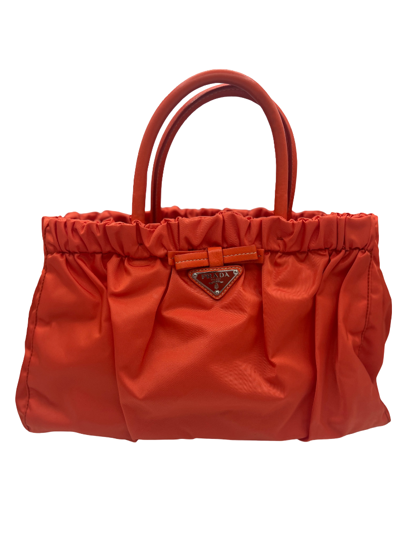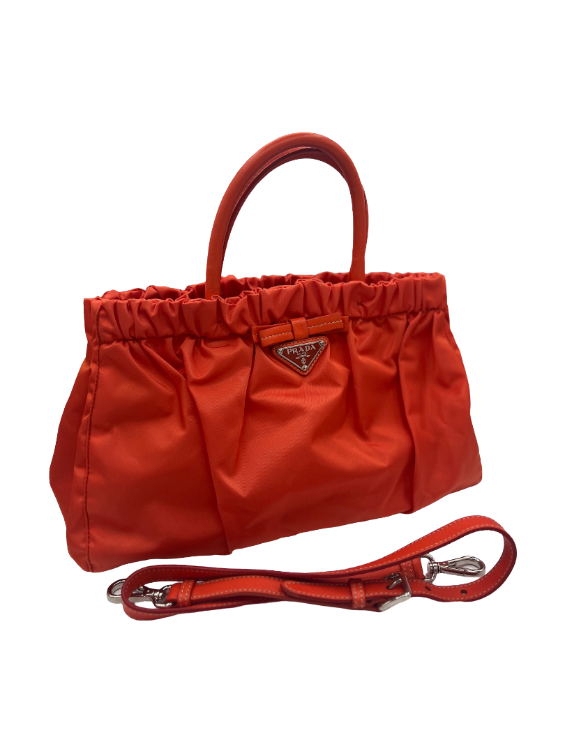 This PRADA Gathered Bag Handbag is a stylish addition to any wardrobe. The vibrant orange color and gathered design make it a standout piece.