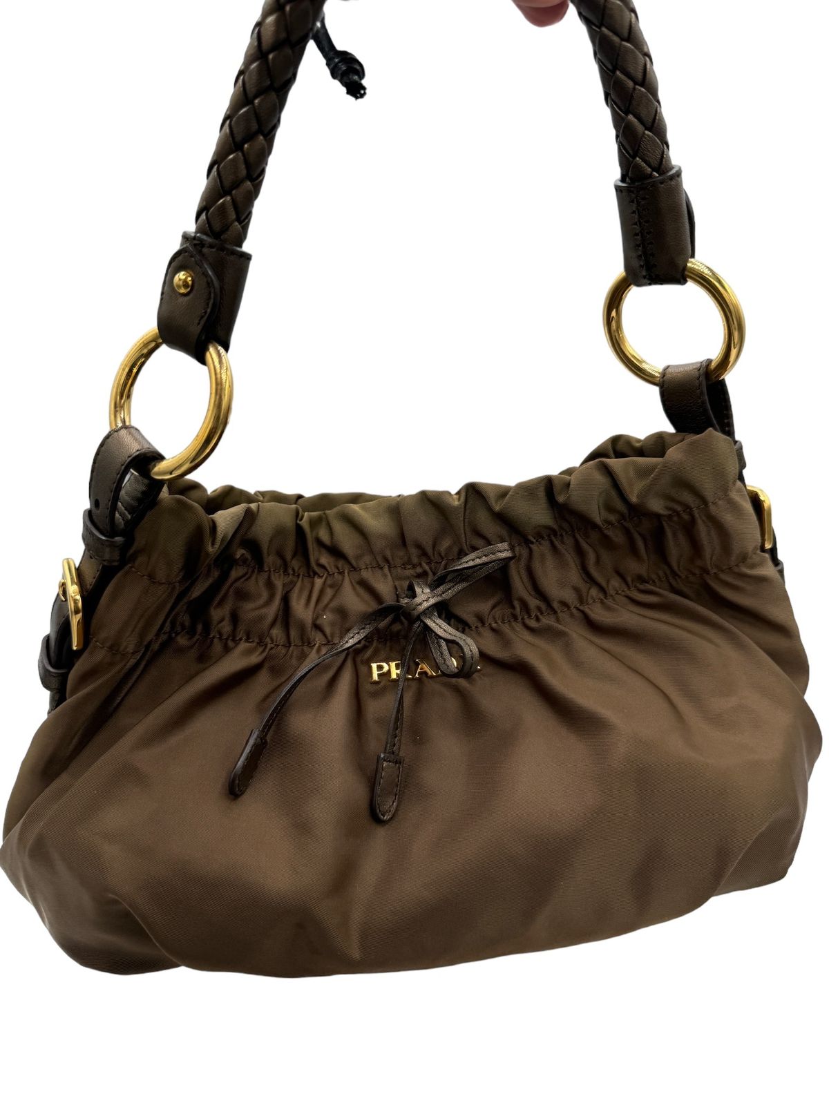 PRADA - Gathered Handbag Khaki Nylon Leather