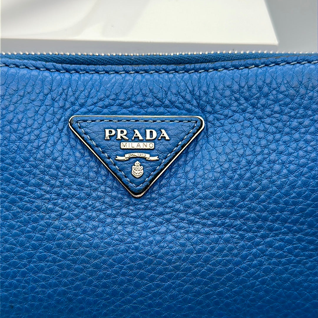 This stunning blue Prada side bag is perfect for any occasion, long strap that can be removed and adapted as a clutch.