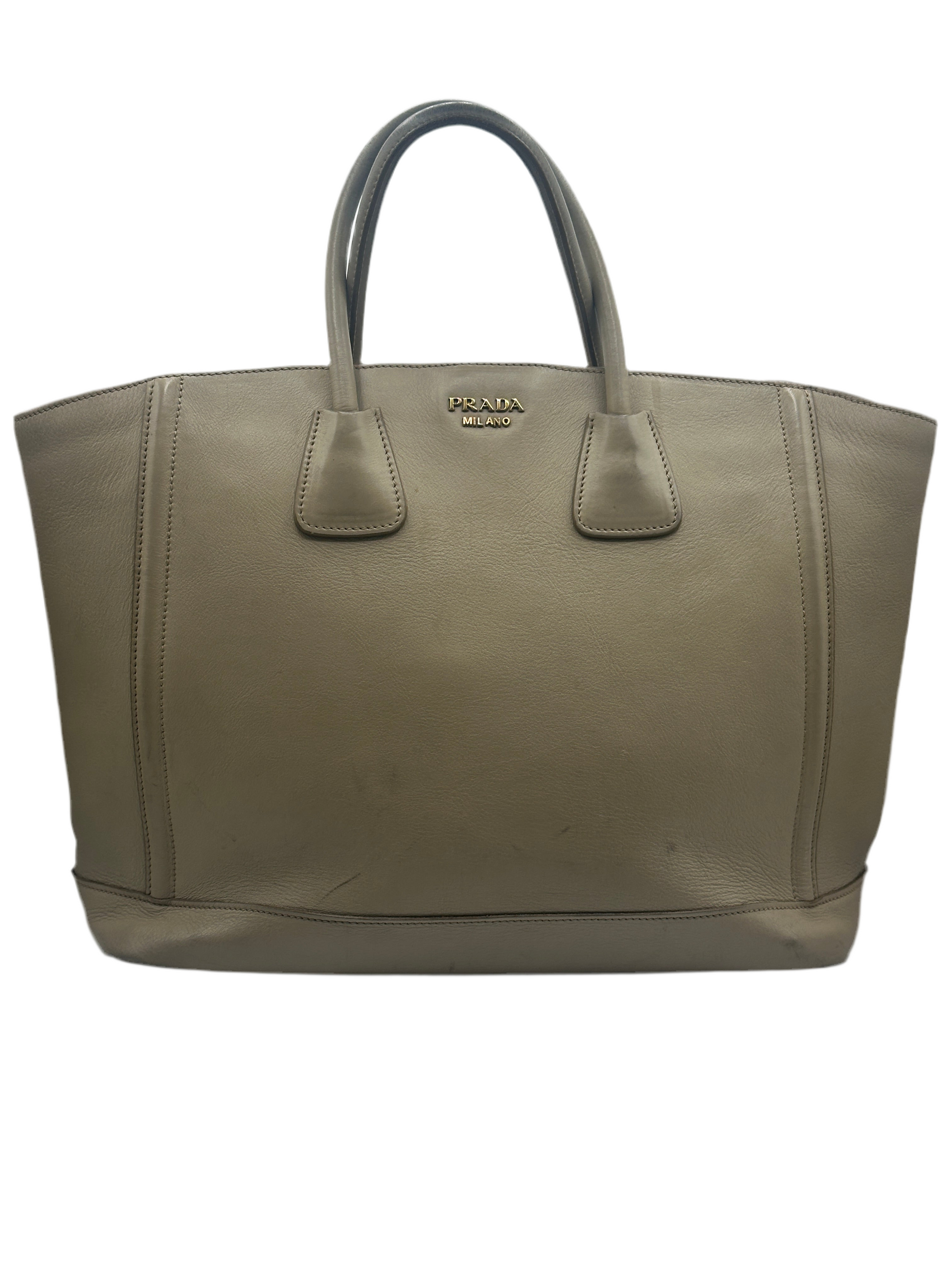The Prada Nude Leather Shopping Tote is a sophisticated accessory crafted from premium nude-coloured leather, exuding understated elegance. Its minimalist design is complemented by clean lines and subtle detailing, making it a versatile addition to any wardrobe. -