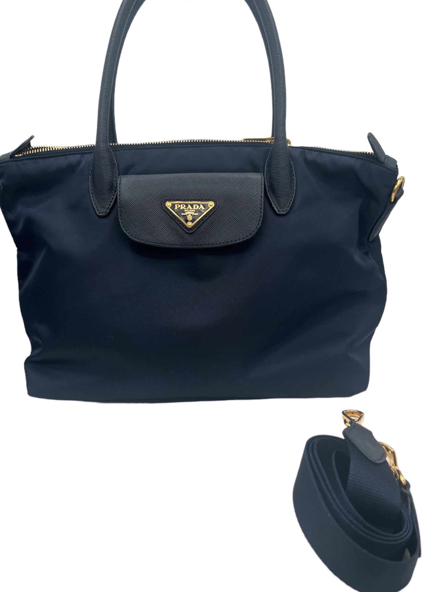 This PRADA shoulder bag comes in a stylish navy blue Tessuto and nylon leather fabrication that adds a chic touch to any outfit. The golden toned hardware provides a luxurious accent to the bag and enhances its overall look.