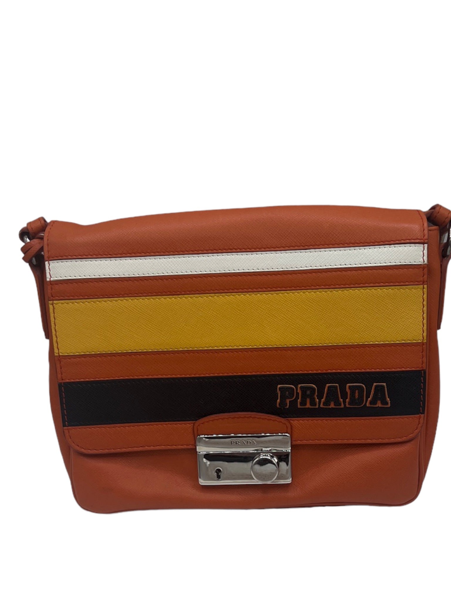 If you're looking for a unique piece that's both stylish and functional, then this orange multi leather crossbody from PRADA is definitely worth considering!