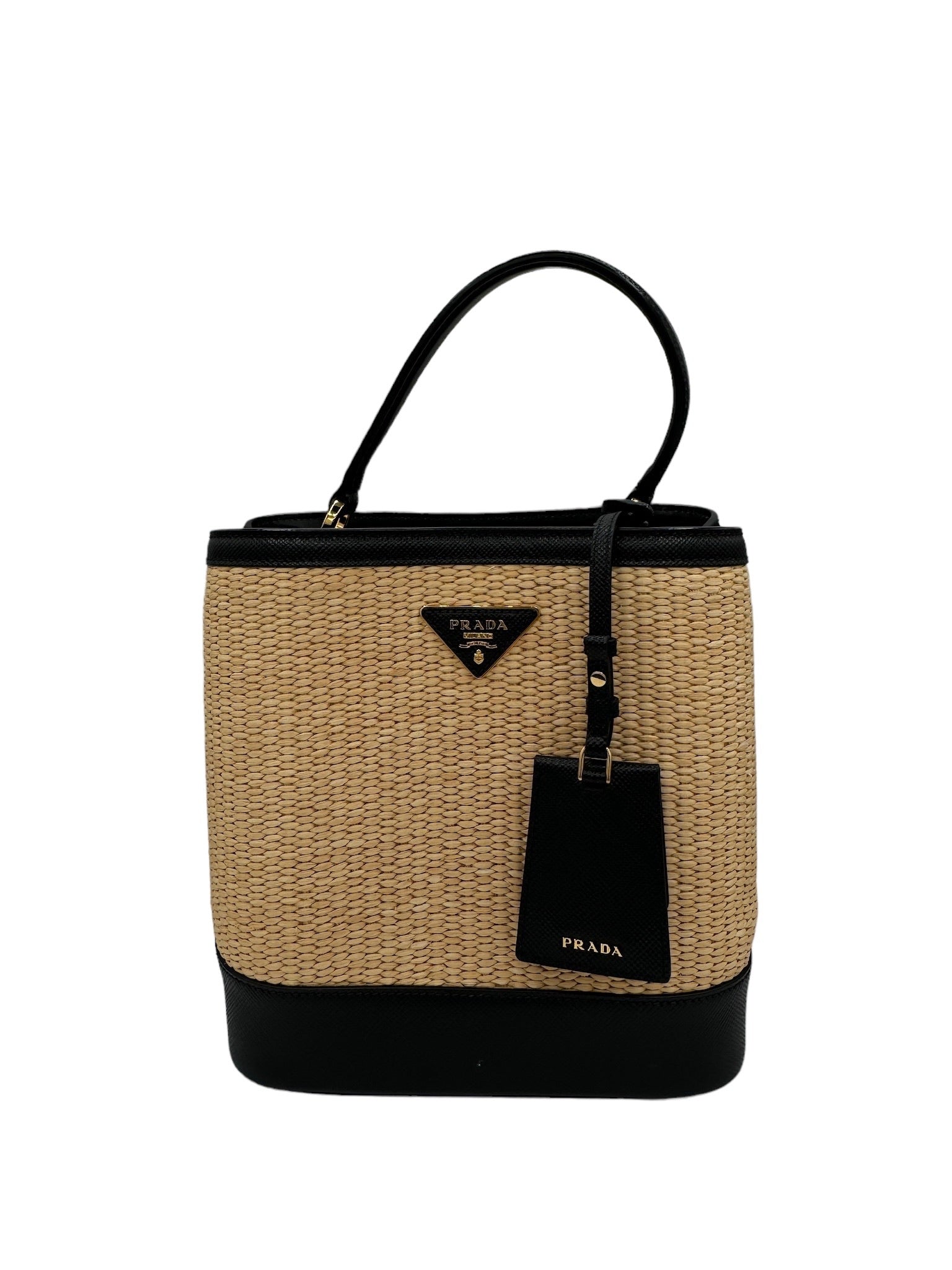 PRADA - Panier Handbag Beige Black Straw Saffiano Leather
