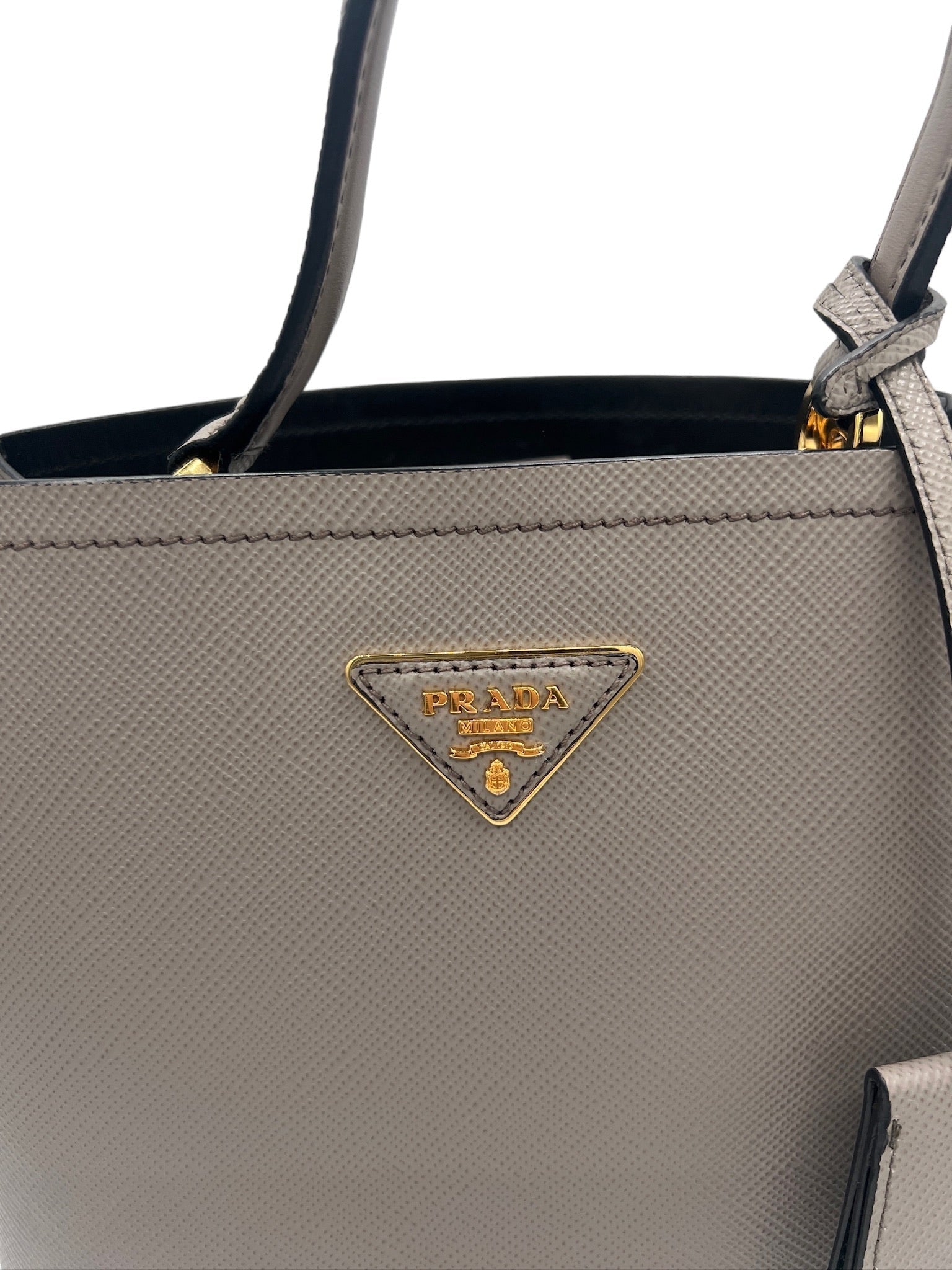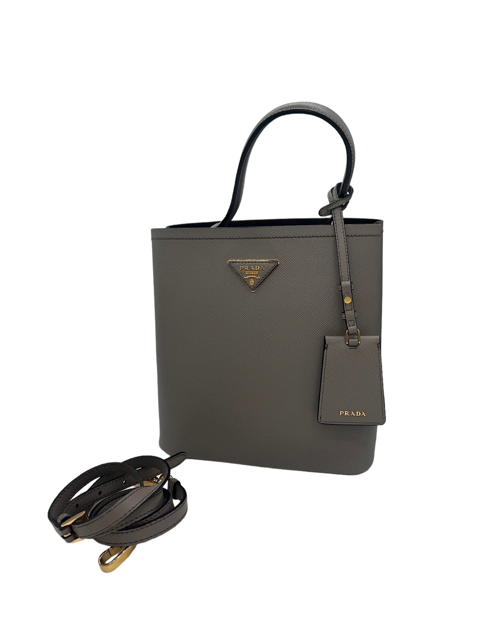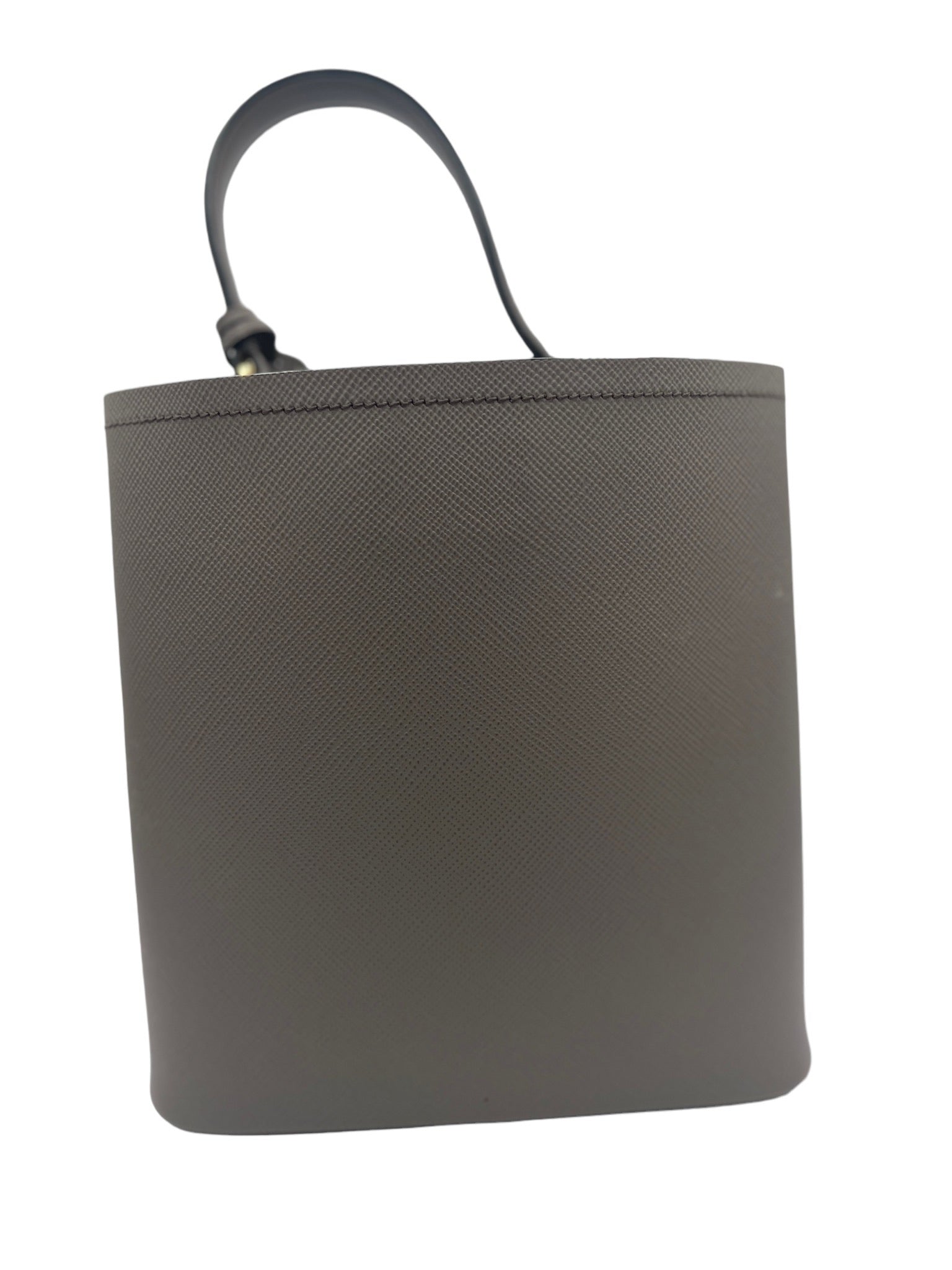 This PRADA Panier Leather Gray Saffiano Handbag is a shoulder bag that is sure to impress. Crafted from high-quality leather, it exudes luxury and style. The gray color adds a touch of sophistication to any outfit, making it a versatile accessory for any occasion.