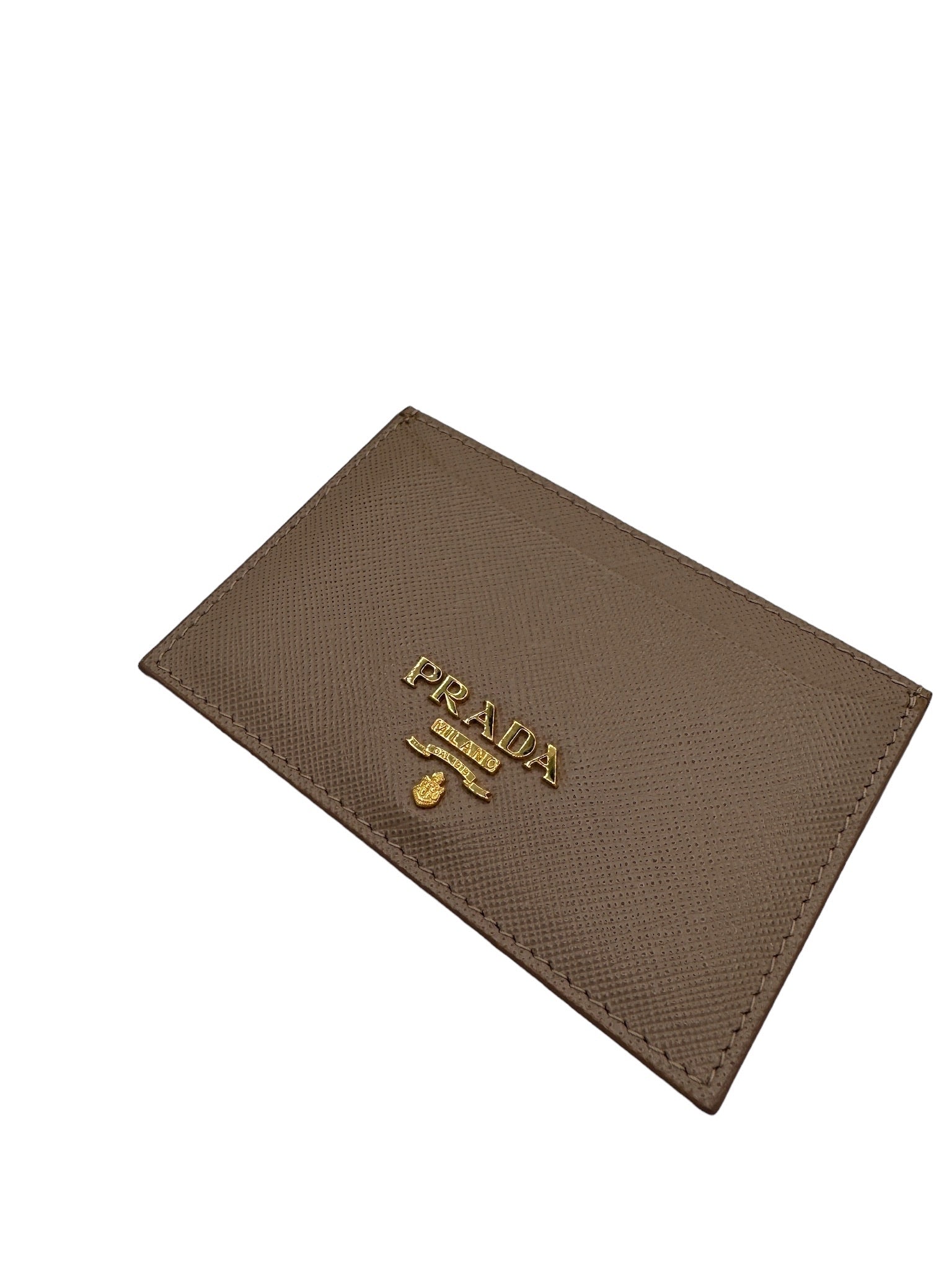 This PRADA card case in a beautiful pink beige hue is the perfect accessory for any fashionista on the go.