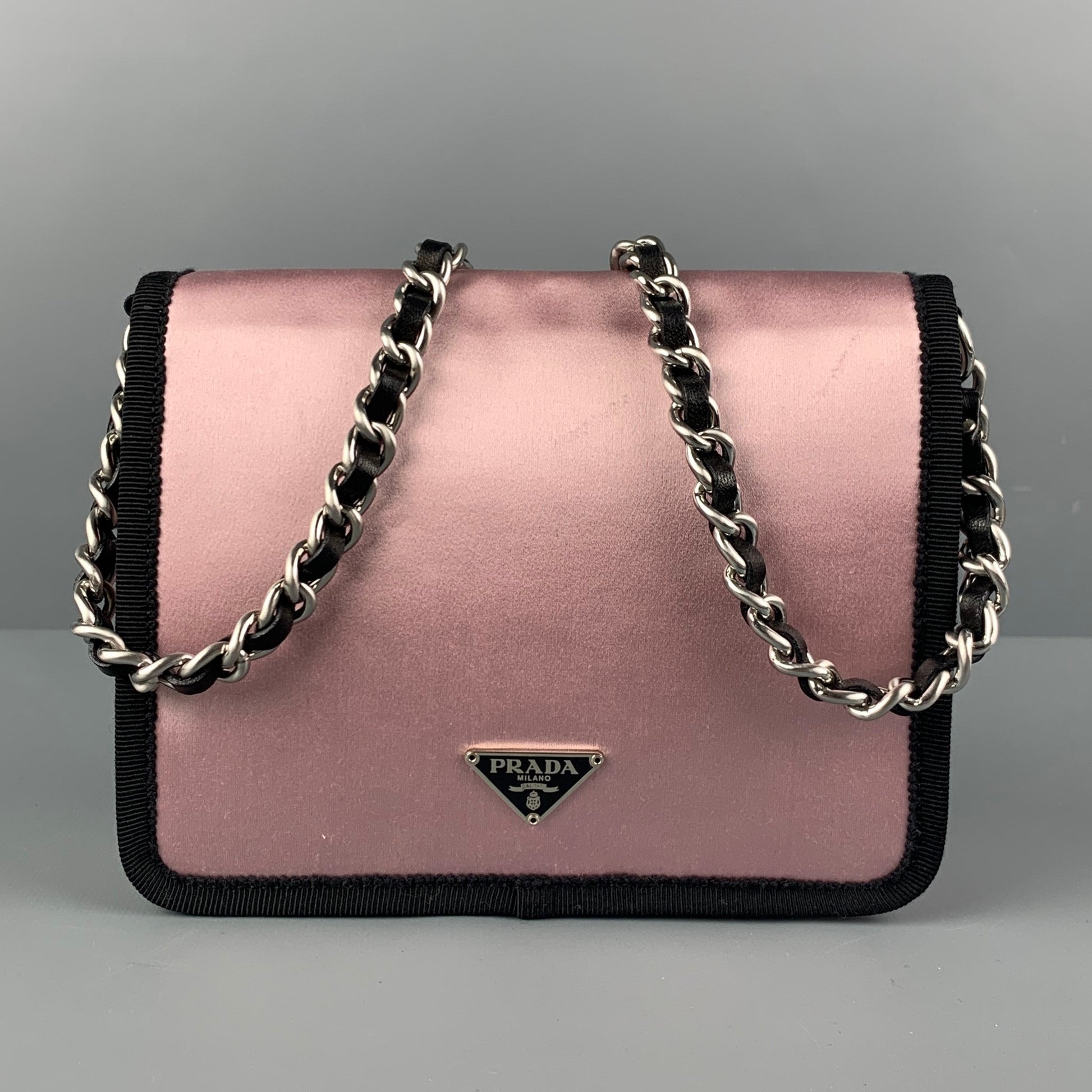 PRADA handbag comes in a pink satin silk with a black trim featuring a silver tone chain strap, bow detail, inner pocket, and a snap button closure.