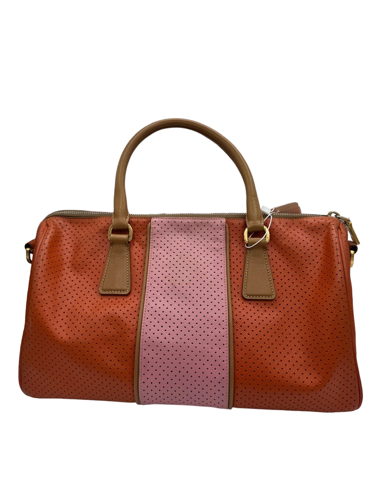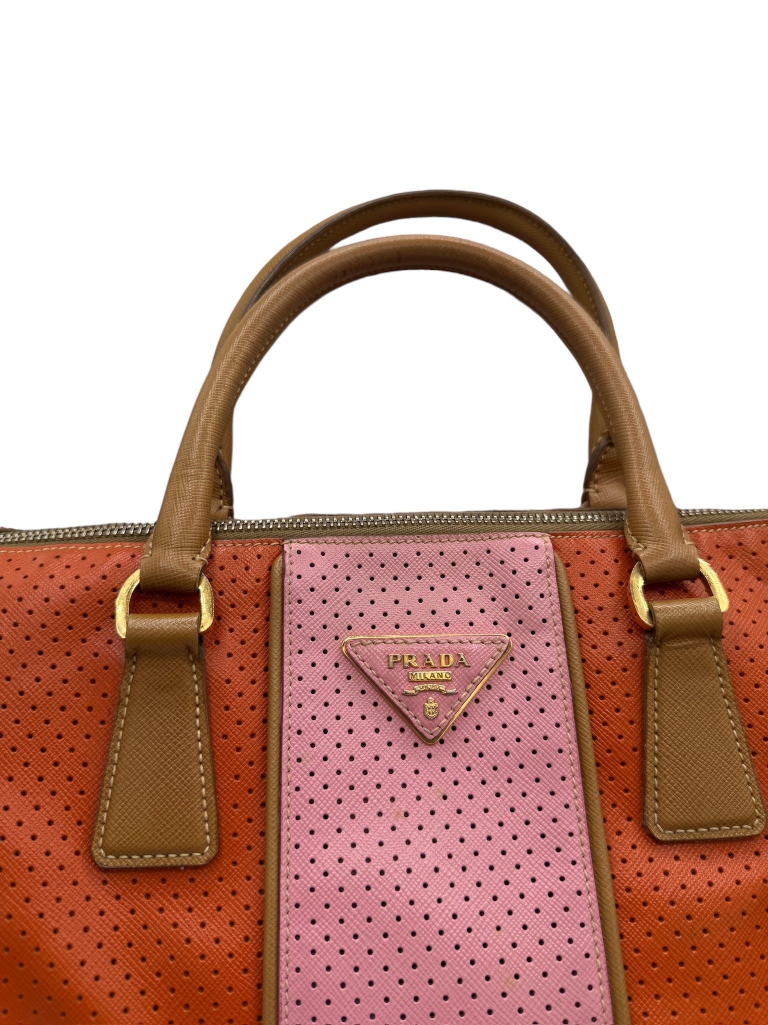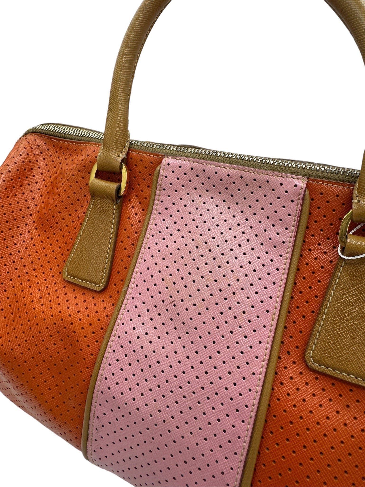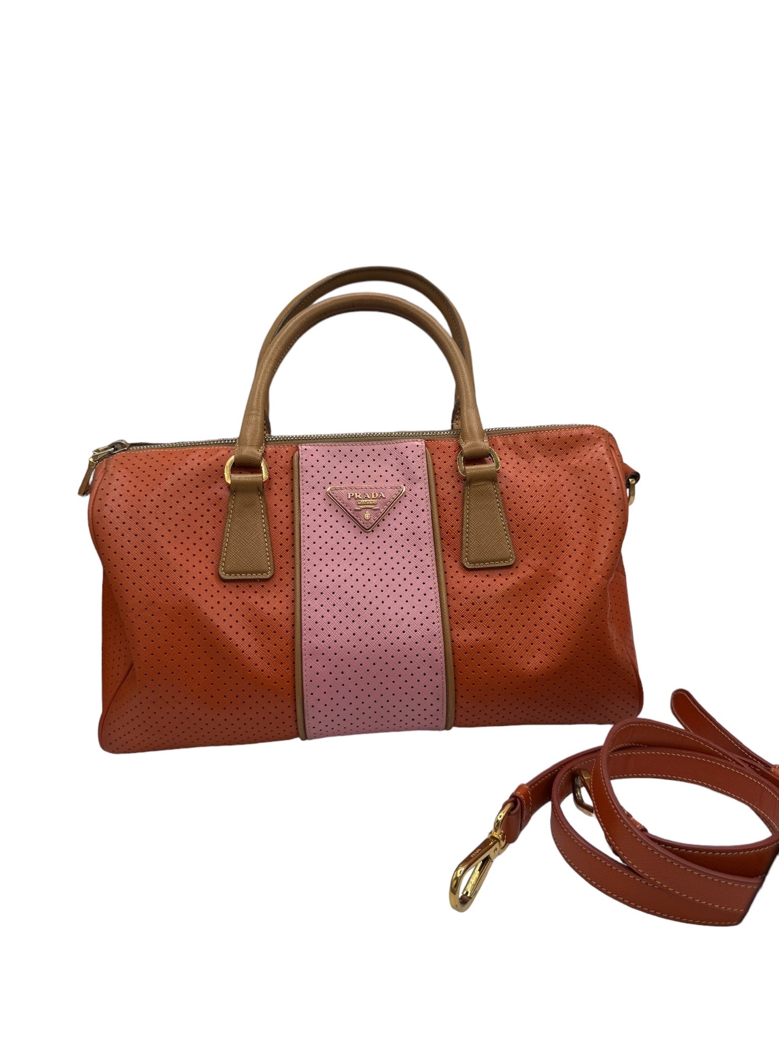 This PRADA shoulder bag in good condition is perfect for any fashionista. The stunning pink and orange color combination is sure to turn heads.
