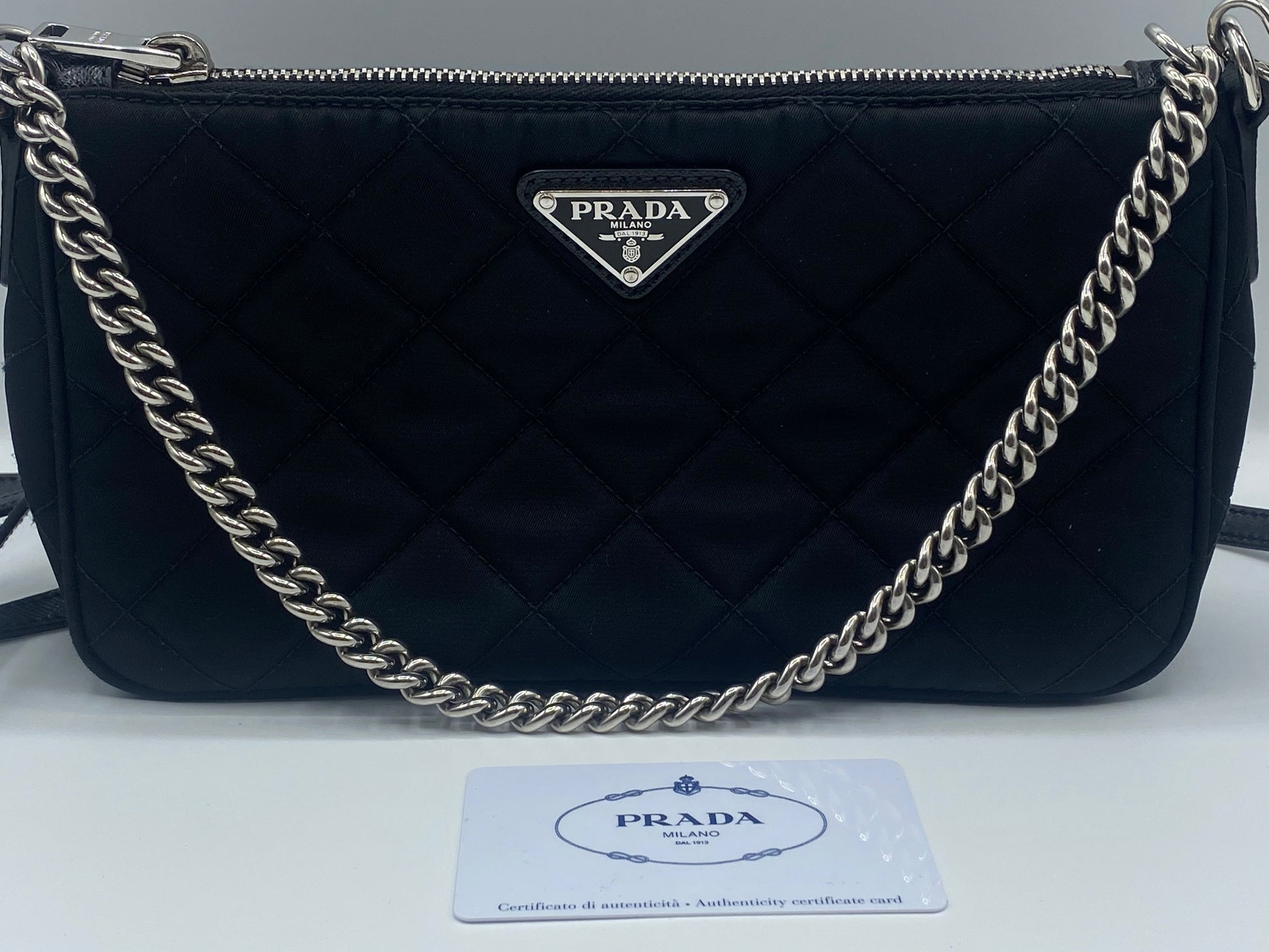 This handbag is made with Prada''s signature nylon in quilted black. The bag features top zip closure, silver-tone hardware and black logo jacquard interior lining. The bag is complete with a chain shoulder strap and an optional leather shoulder strap for crossbody.