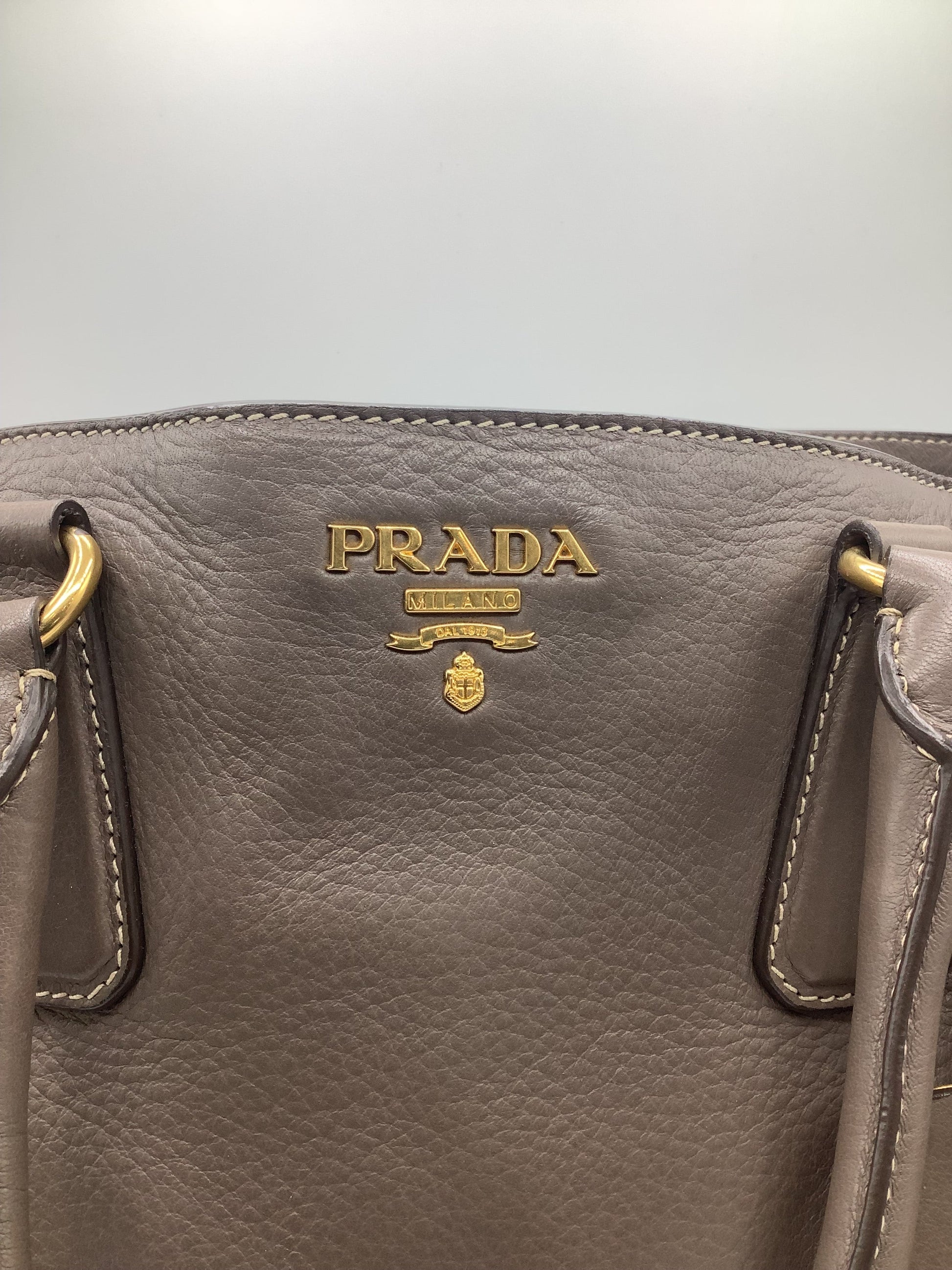 Hardware: Gold-tone metal accents, including the iconic Prada logo plaque.