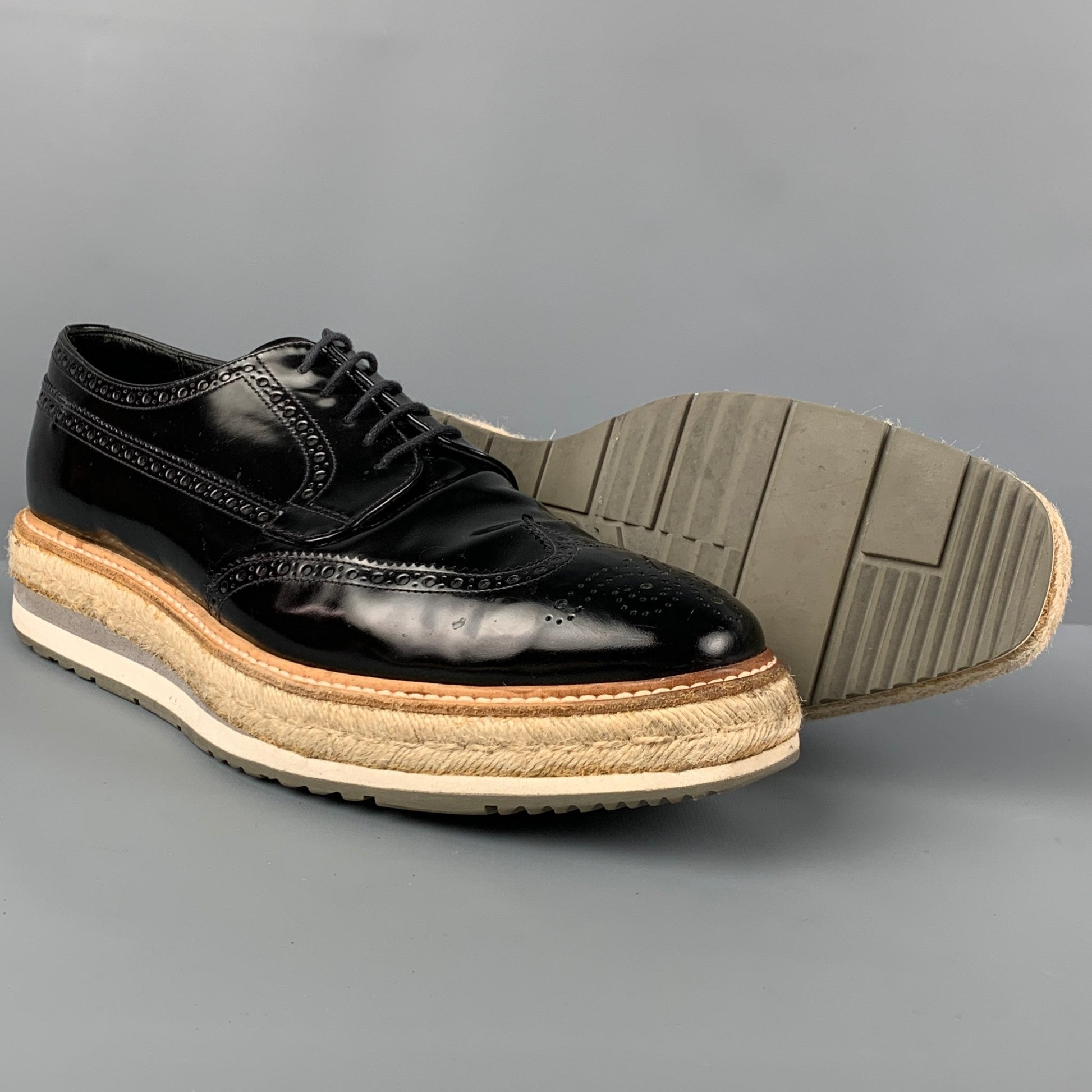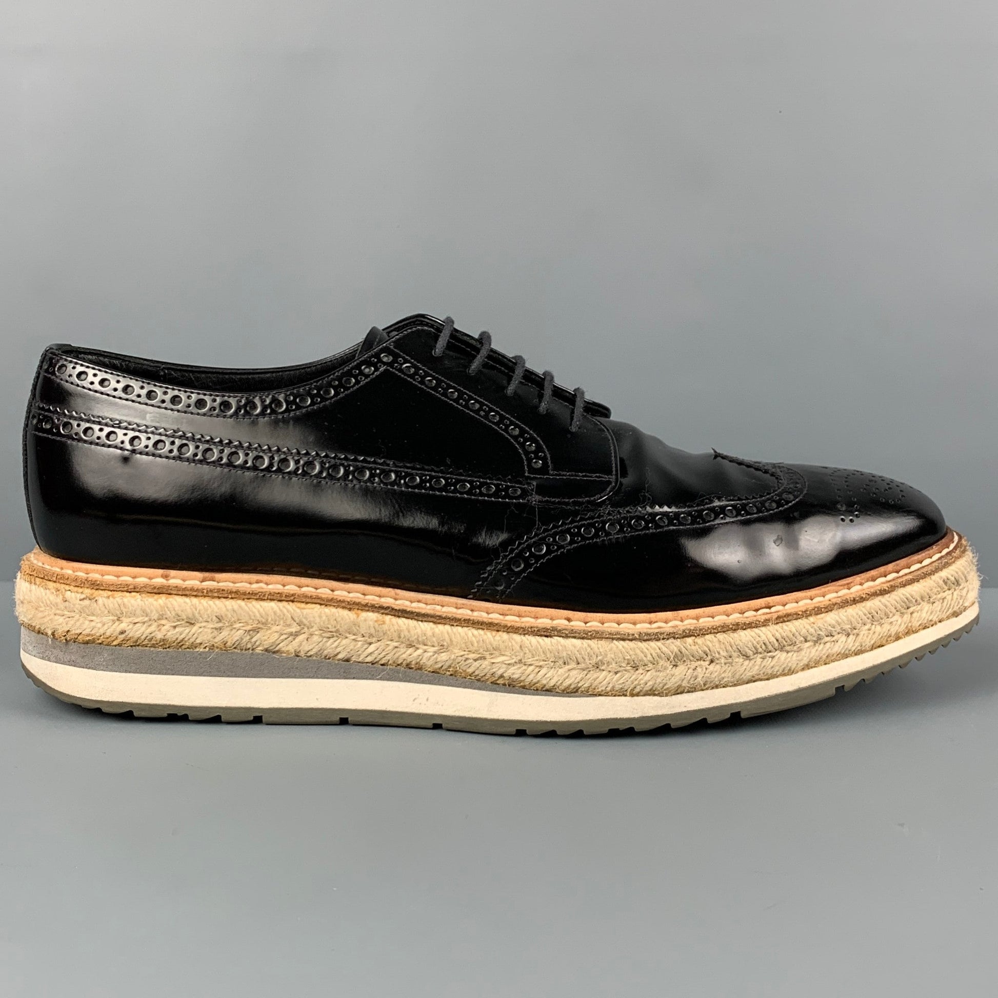 PRADA shoes comes in a black perforated leather featuring a wing tip style, jute trim rubber platform, square toe, and a lace up closure. Made in Italy.