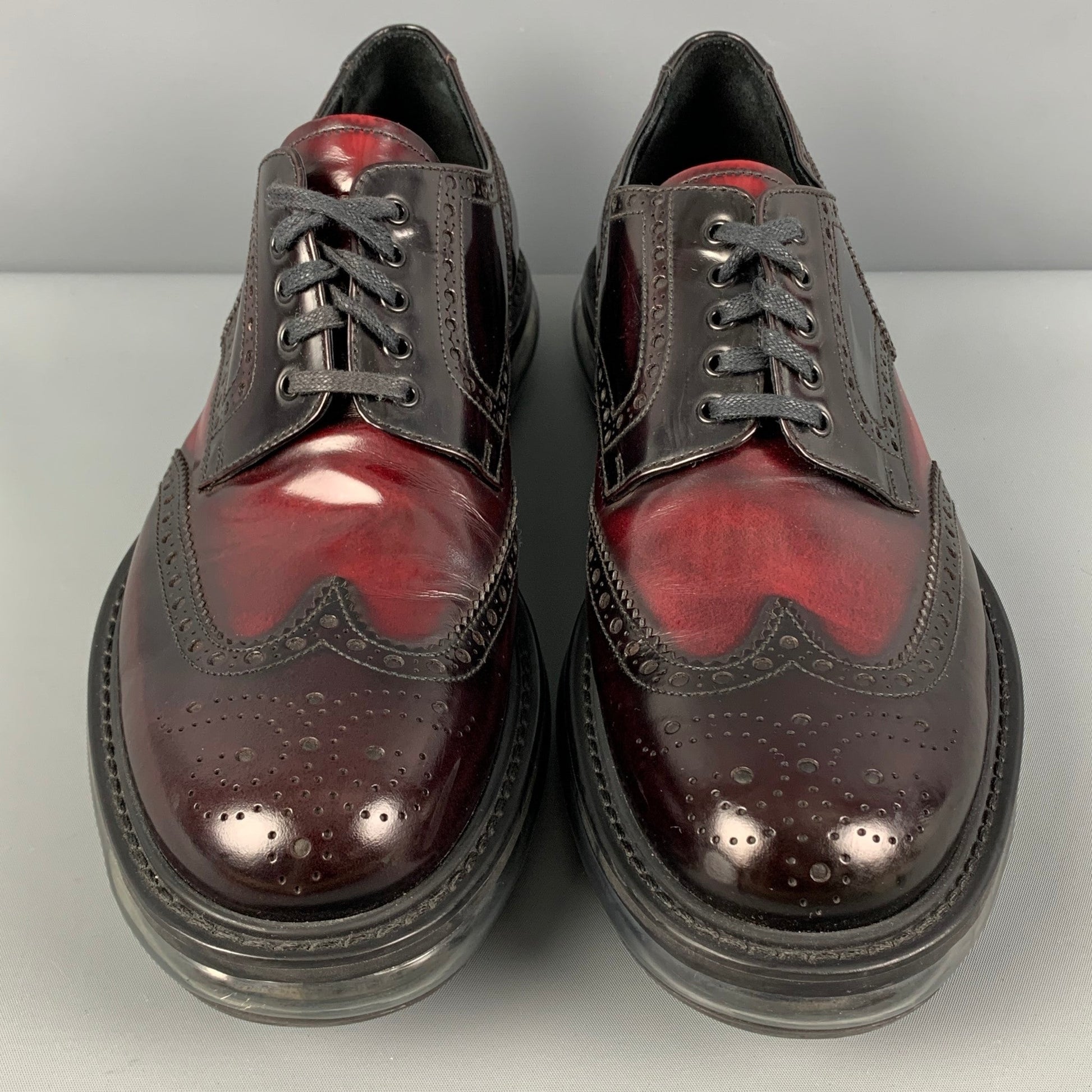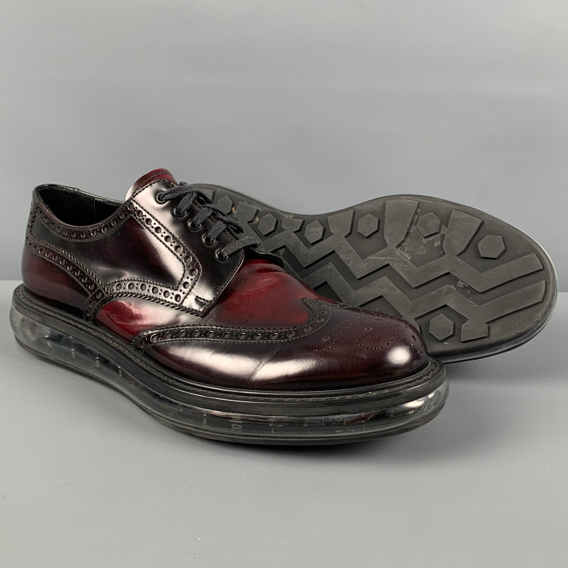 PRADA shoes comes in a burgundy perforated leather featuring a transparent rubber sole and a lace up closure. Made in Italy.
