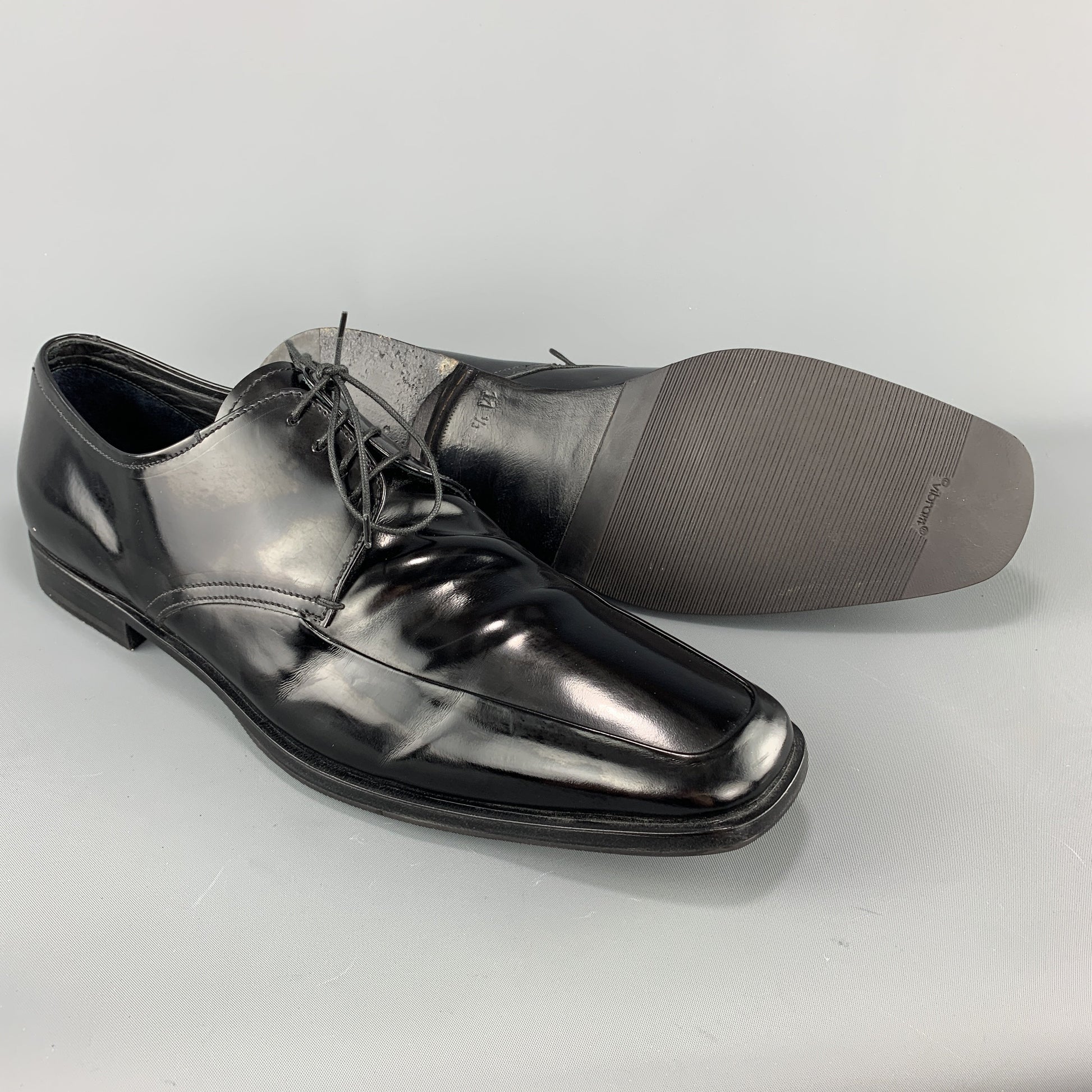 PRADA dress shoes come in shiny black leather with an apron toe. Made in Italy.