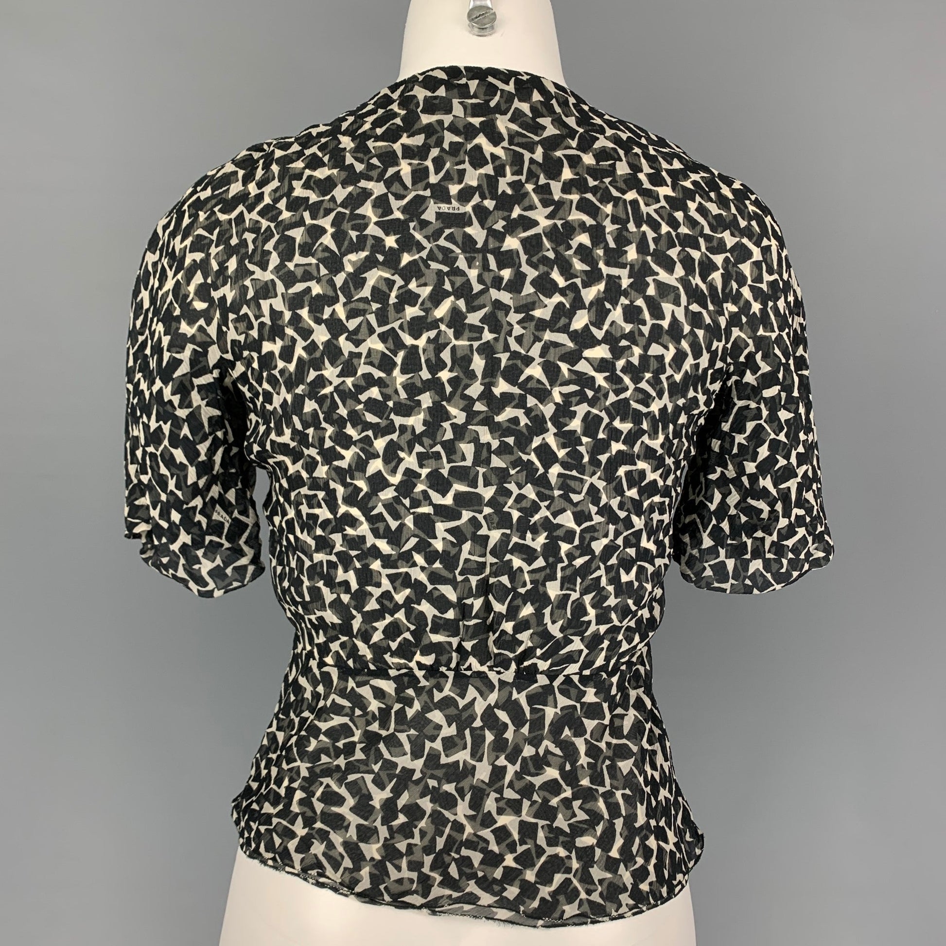 PRADA Size 2 Black White Silk Short Sleeve Blouse