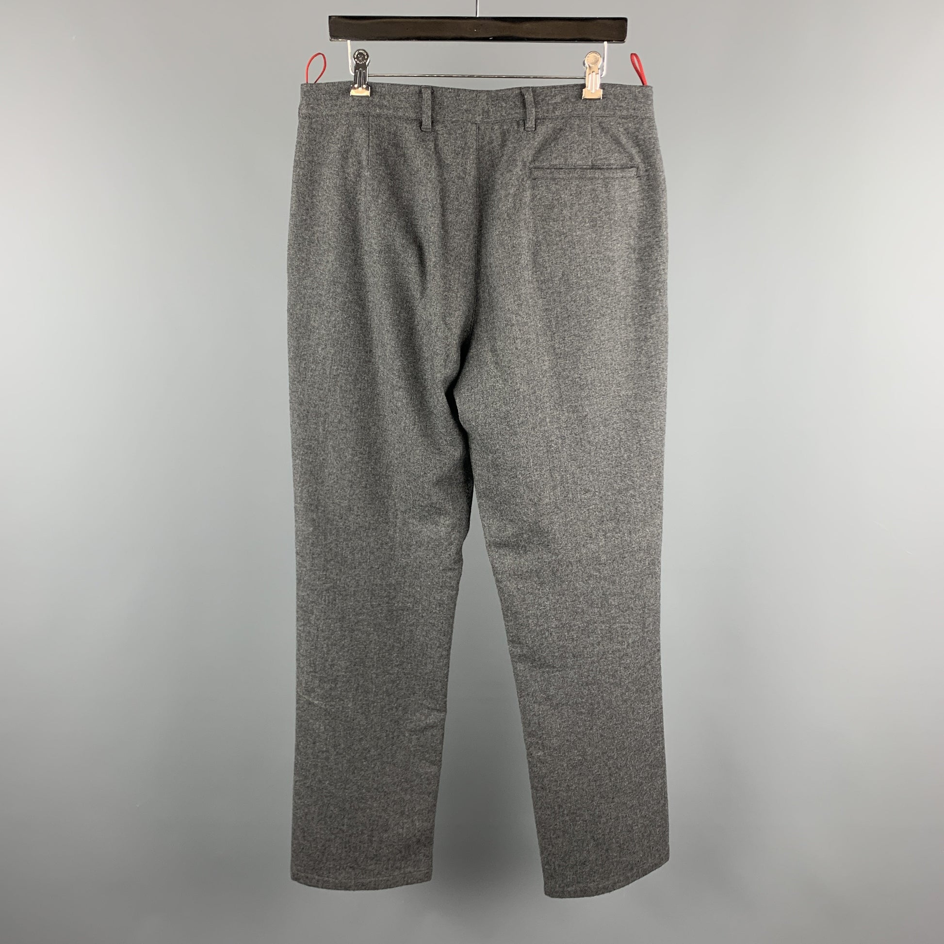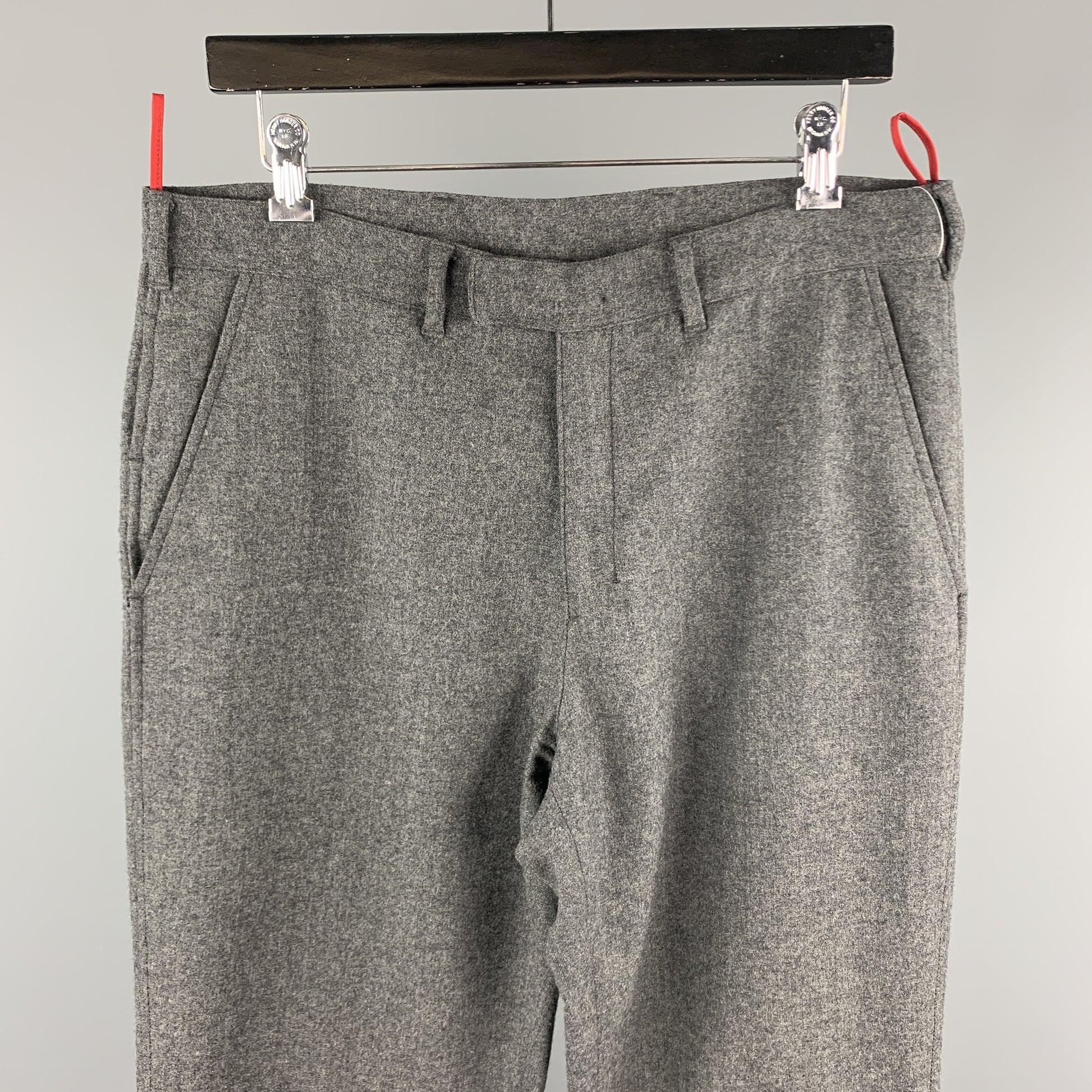 PRADA casual pants comes in a gray wool blend featuring a regular fit, front tab, and a zip fly closure. Made in Italy.