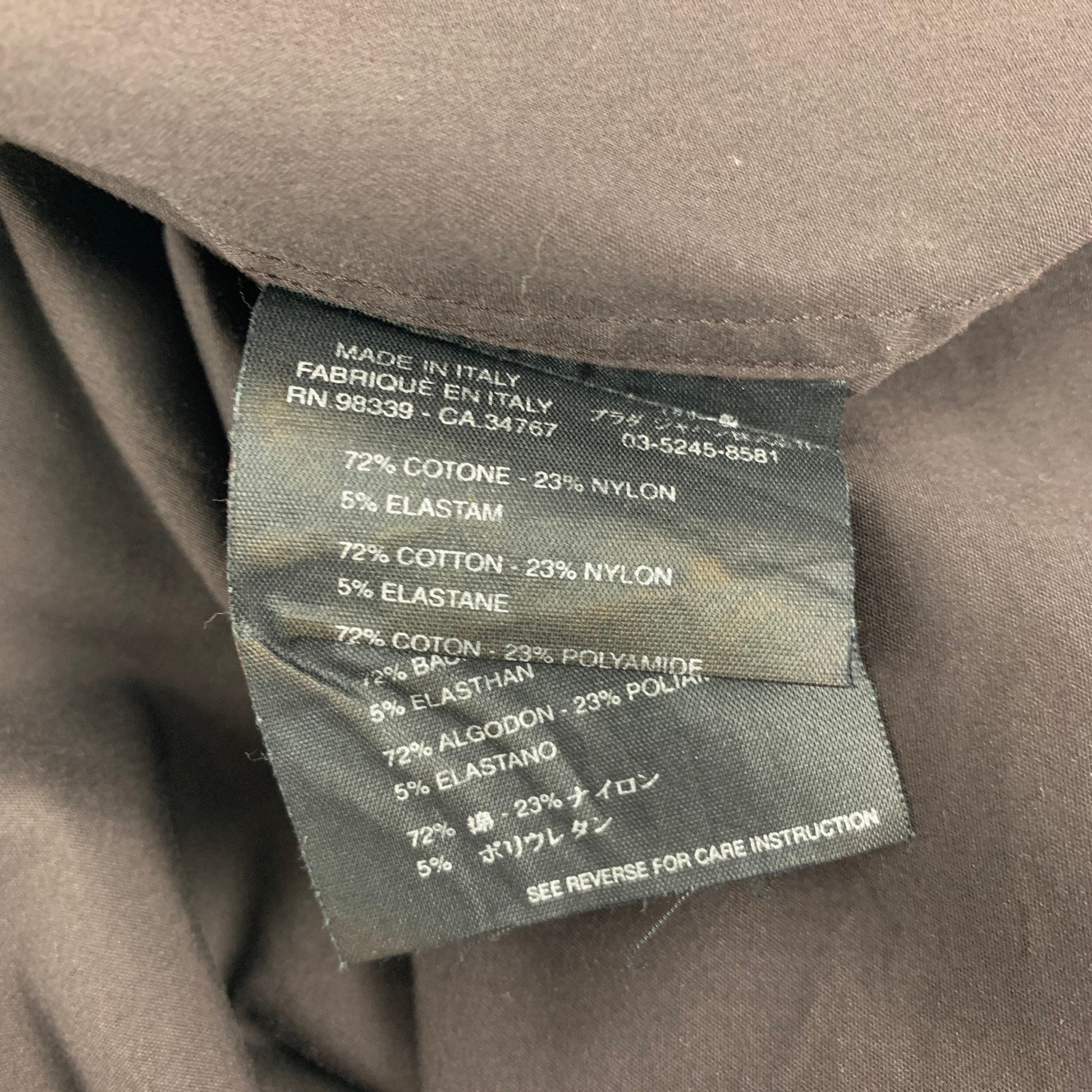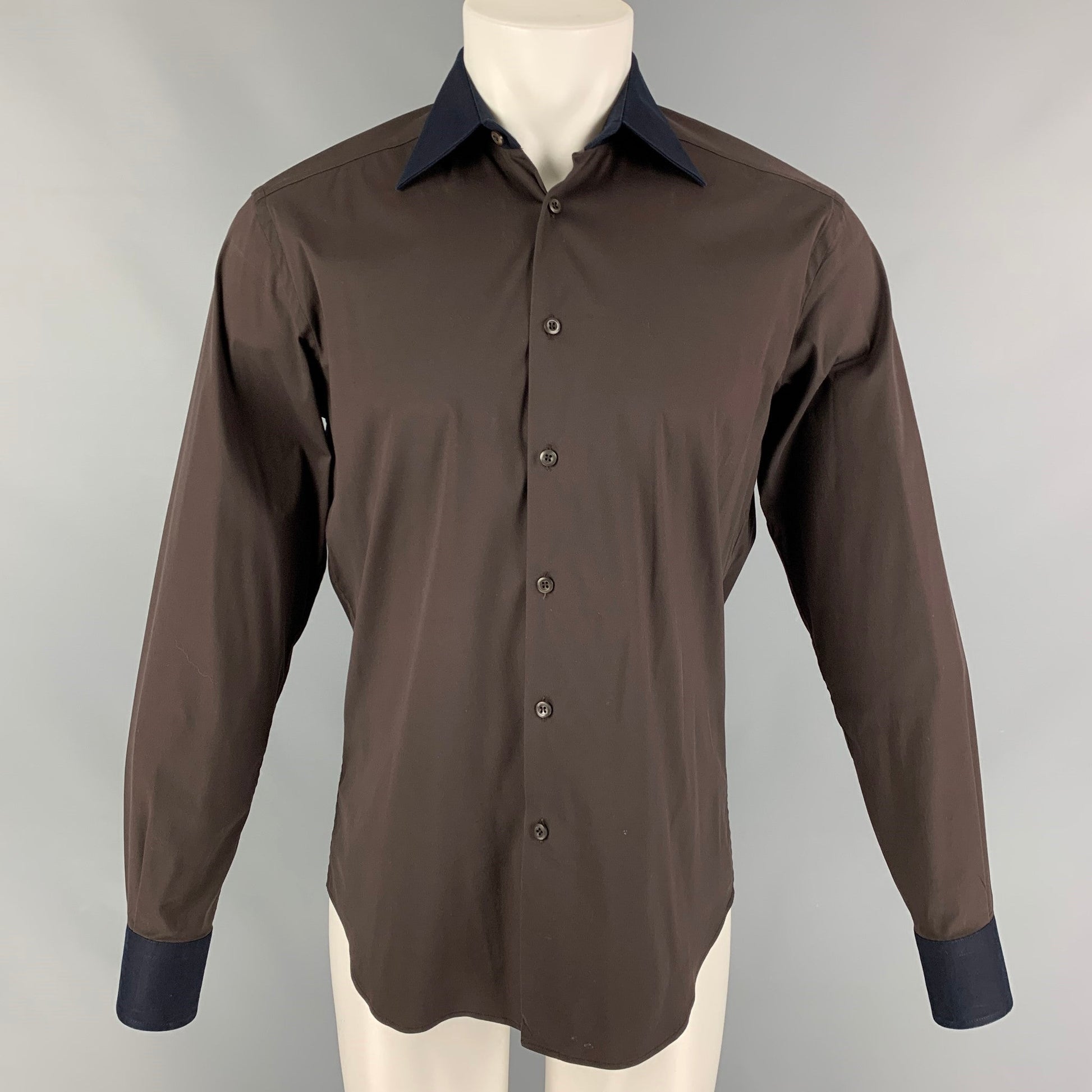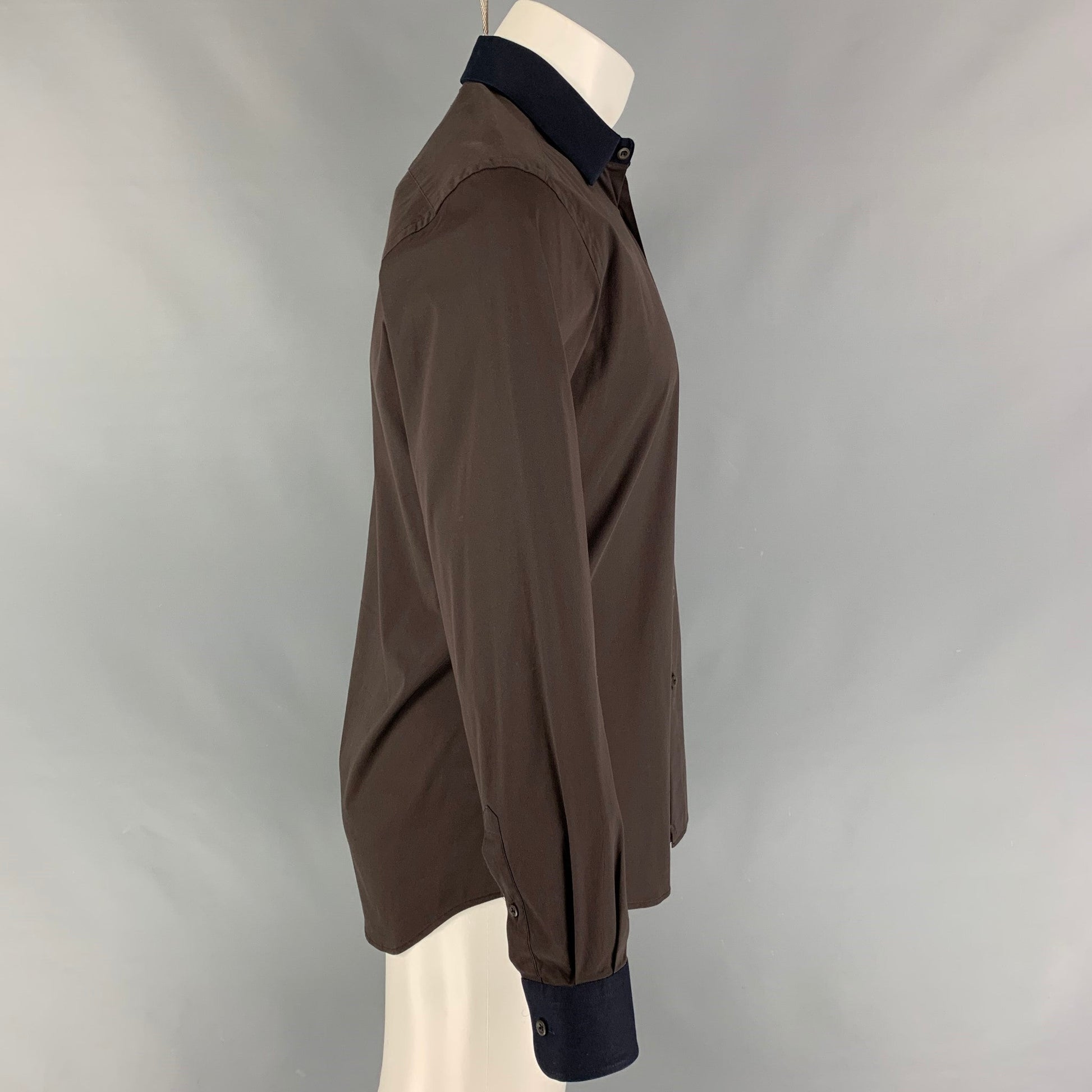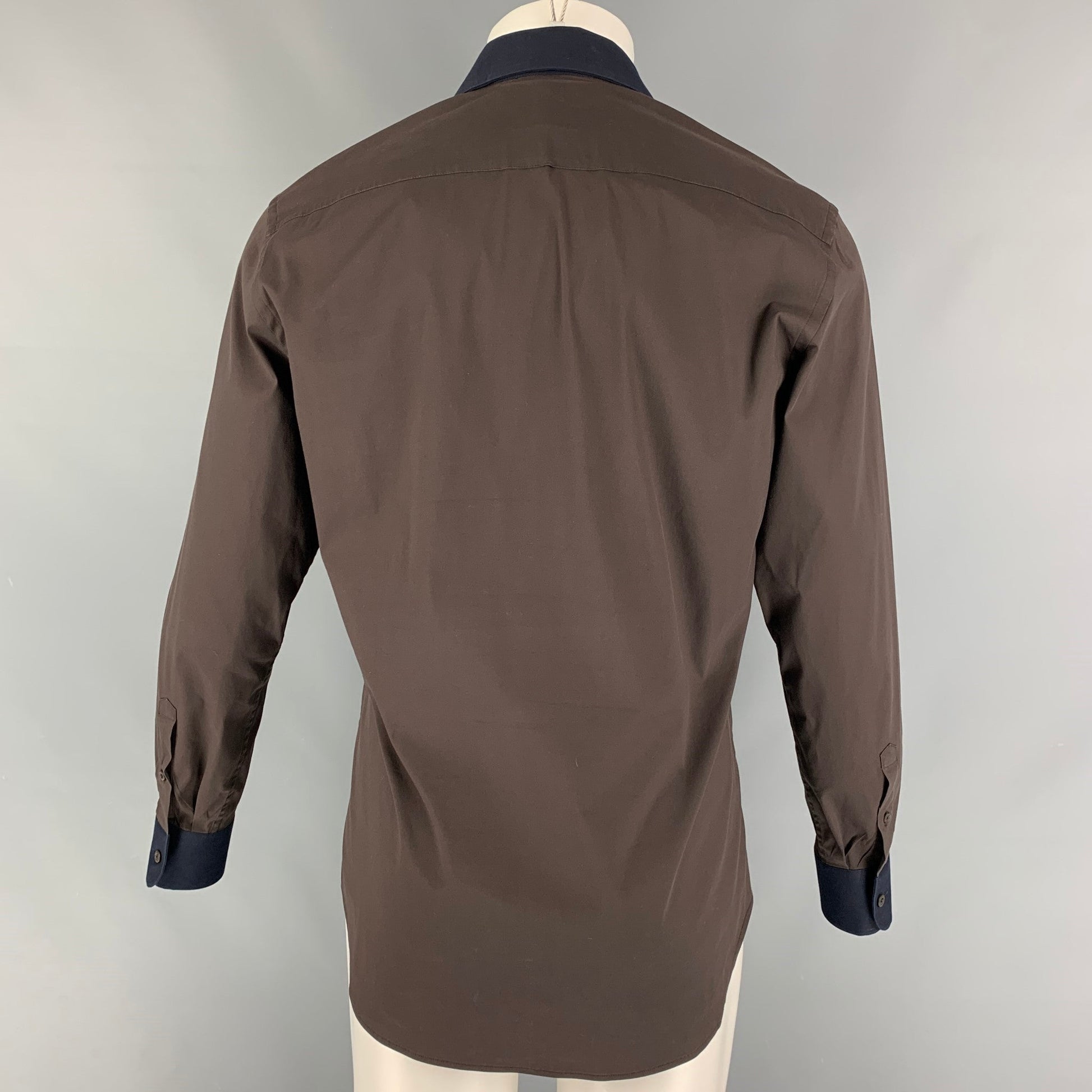 PRADA long sleeve shirt comes in a brown cotton blend with a navy spread collar featuring a button up closure. Made in Italy.
