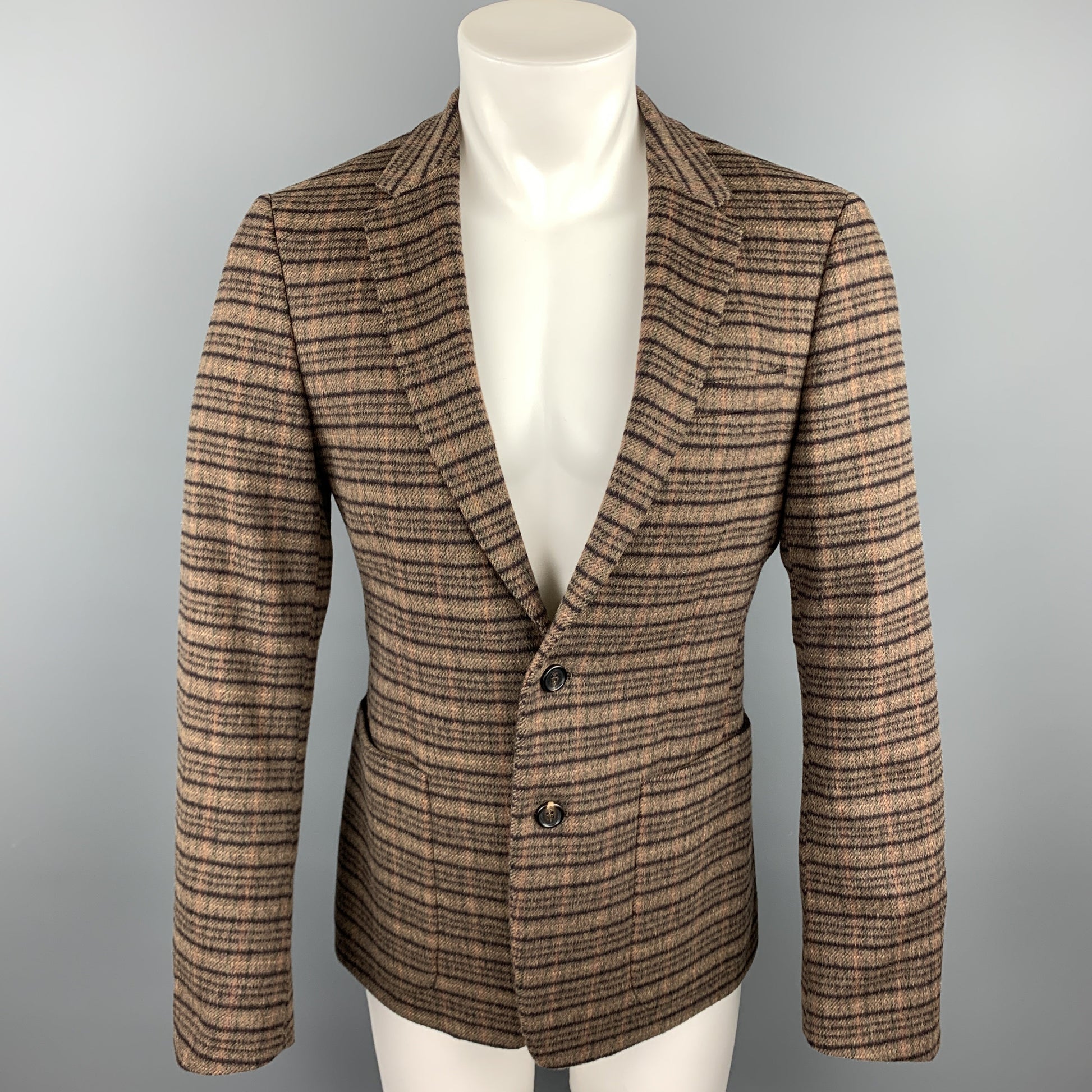 PRADA sport coat comes in a brown plaid lana wool / alpaca featuring a notch lapel style, patch pockets, and a two button closure. Made in Italy.