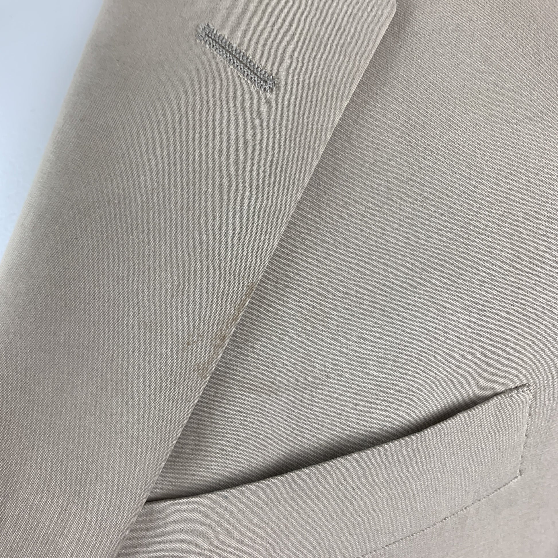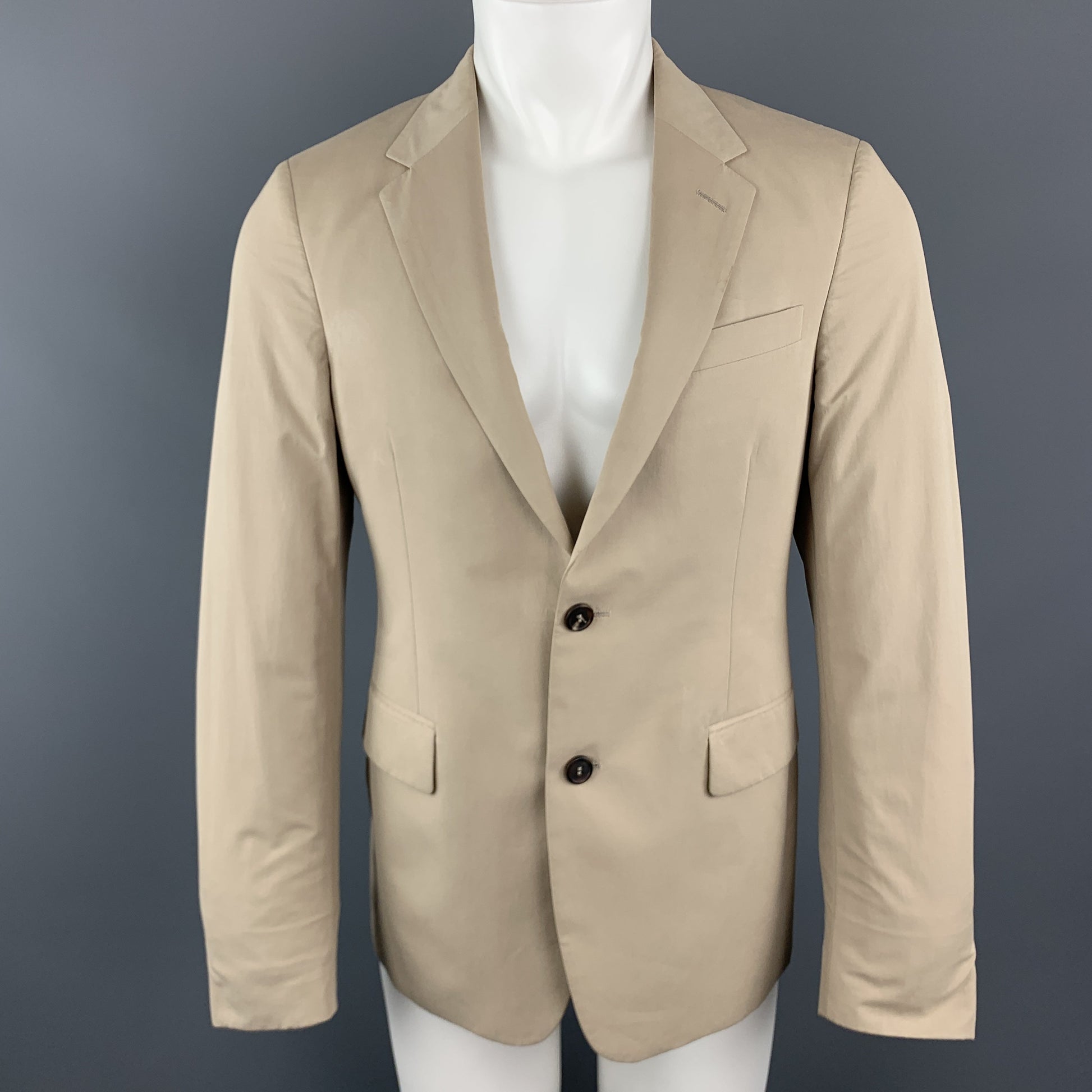 PRADA sport coat comes in khaki beige light weight cotton blend fabric with a notch lapel, single breasted, two button front, and half liner. Stain on chest. As-is.