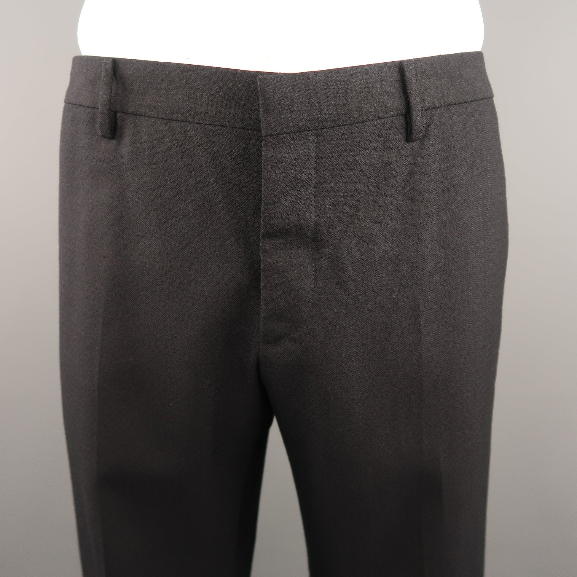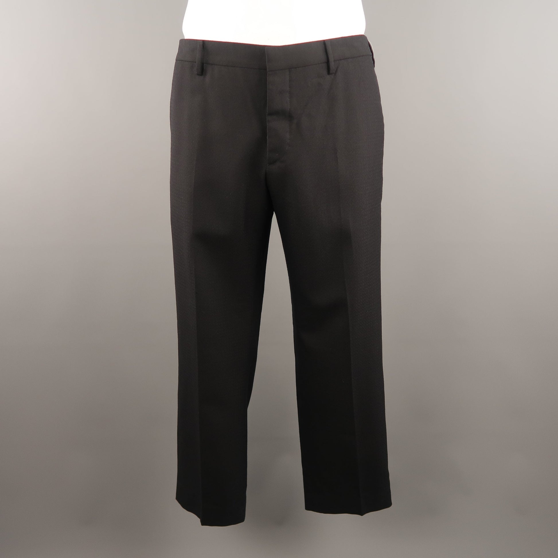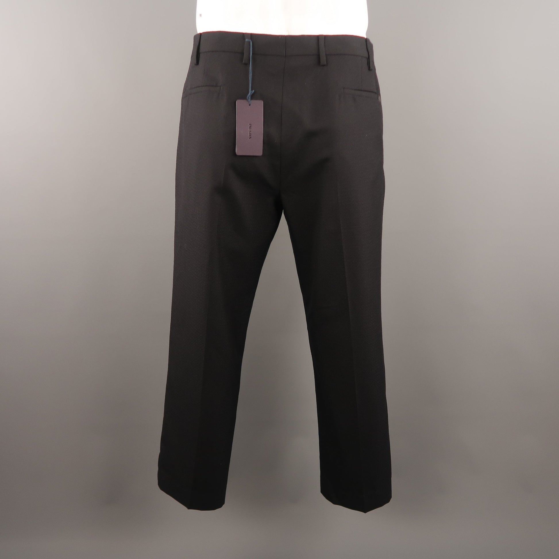 PRADA Classic Dress Pants comes in a navy tone in a checkered wool material, with a seam and slit pocket, button fly. Made in Italy.