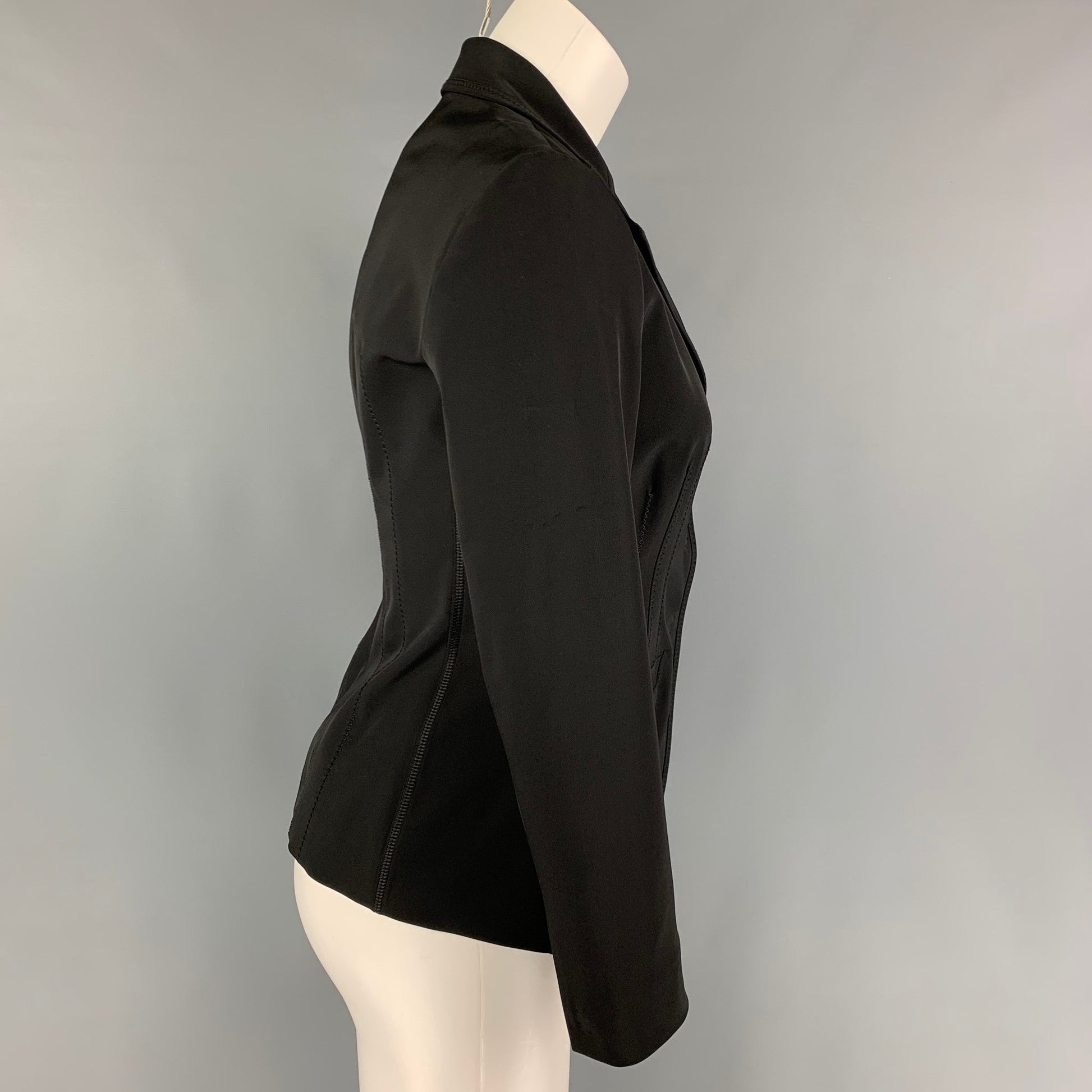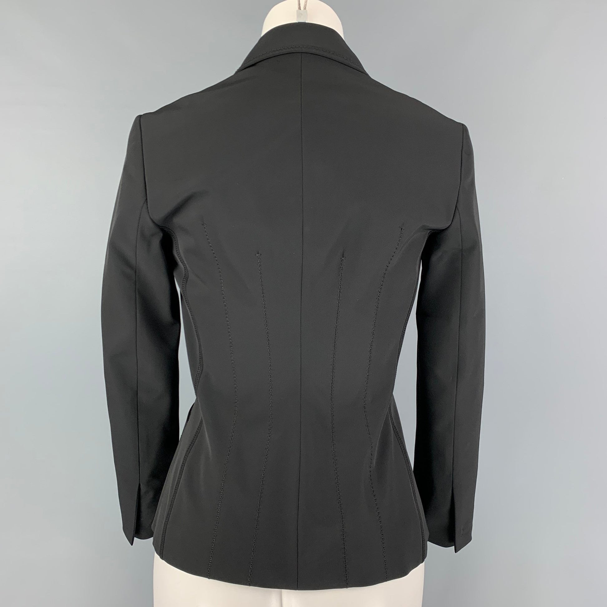 PRADA jacket comes in a black polyester featuring a notch lapel, slit pocket, top stitching, and a hidden snap button closure. Made in Italy.