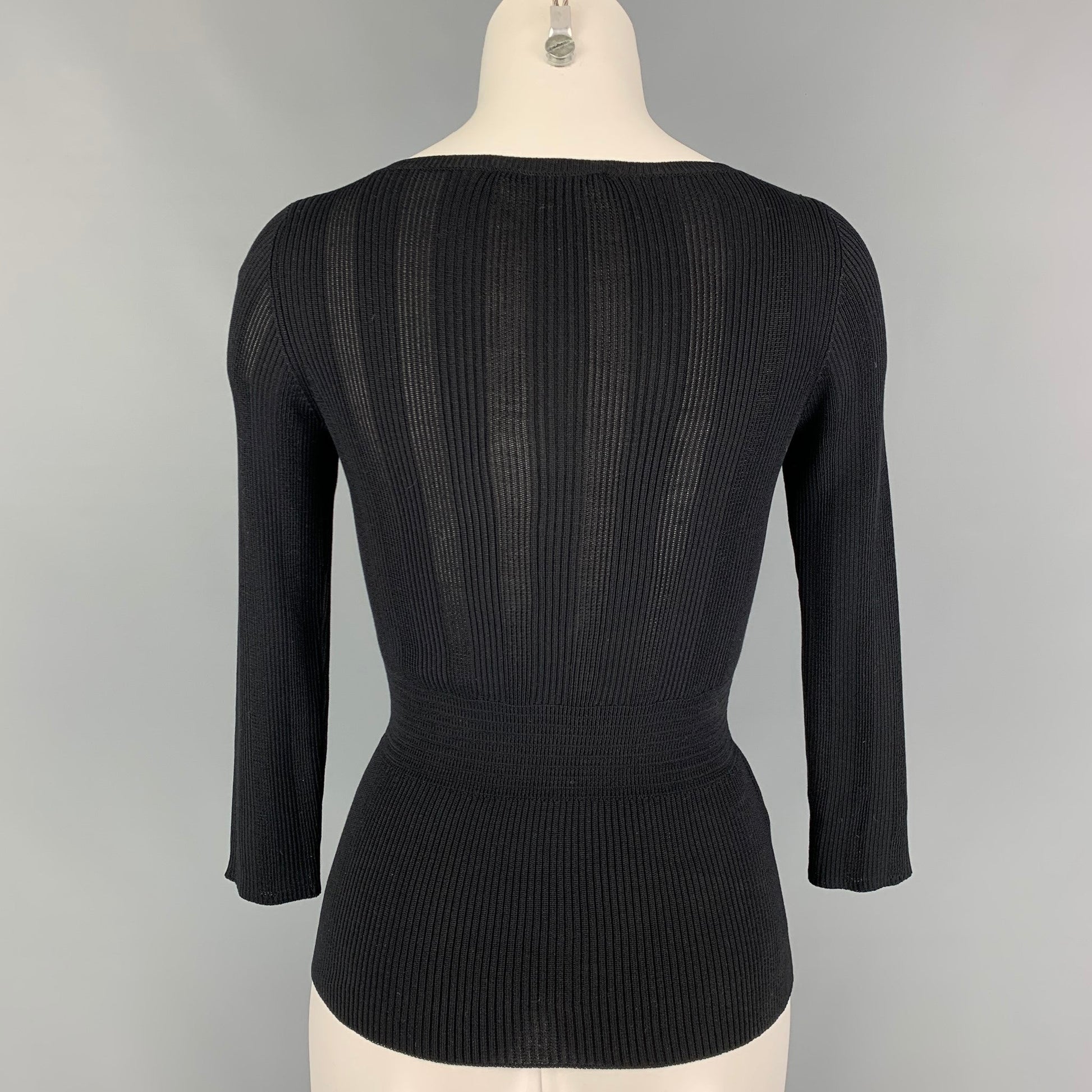 PRADA pullover comes in a black ribbed silk featuring a v-neck. Made in Italy.