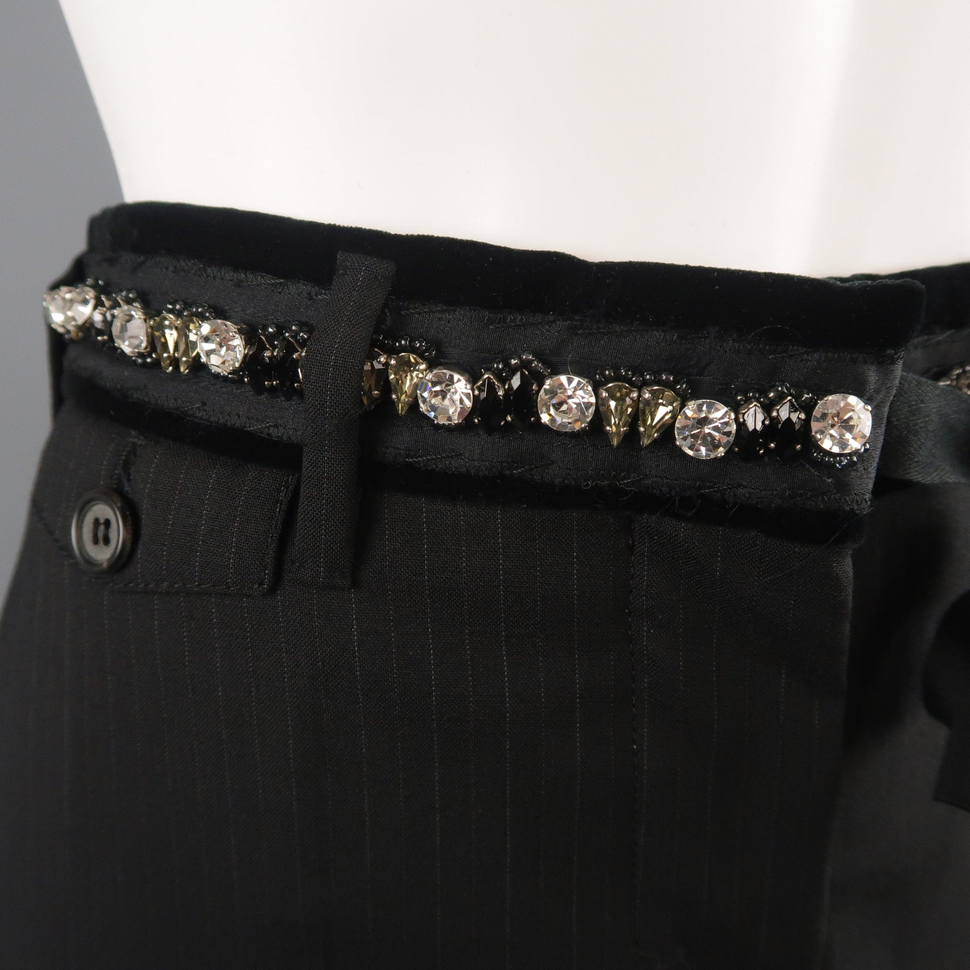 PRADA dress pants come in pinstriped virgin wool with a straight leg and rhinestone studded, velvet trimmed tie waistband. Made in Italy.