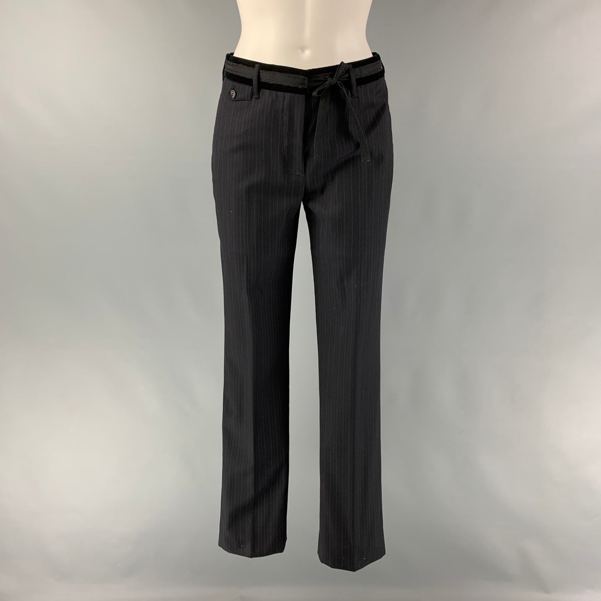 PRADA dress pants comes in a black pinstripe virgin wool featuring a straight style, velvet belt detail, front tab, and a zip fly closure. Made in Italy.