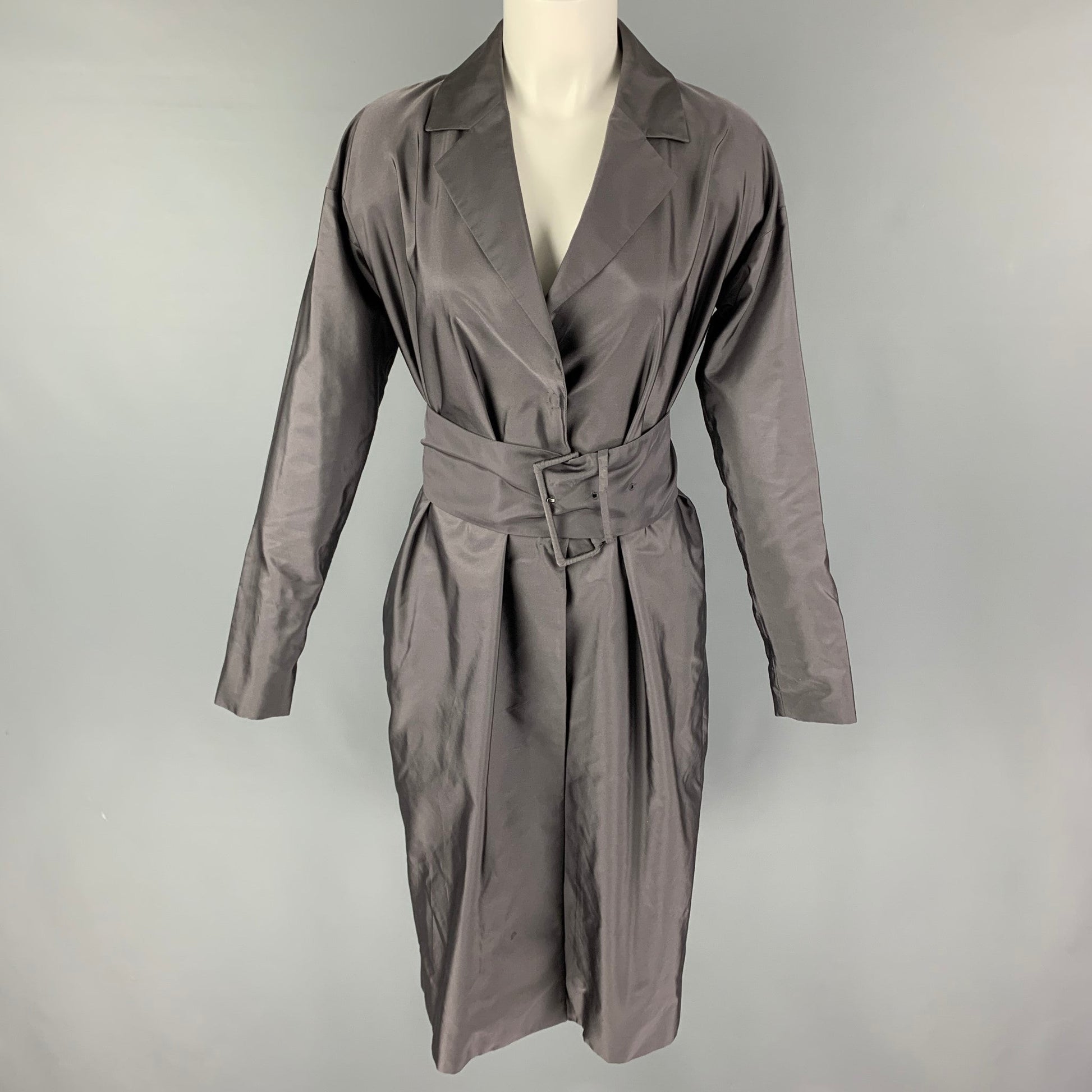 PRADA coat comes in a grey silk featuring a notch lapel, belted, and a hidden snap button closure. Made in Italy.