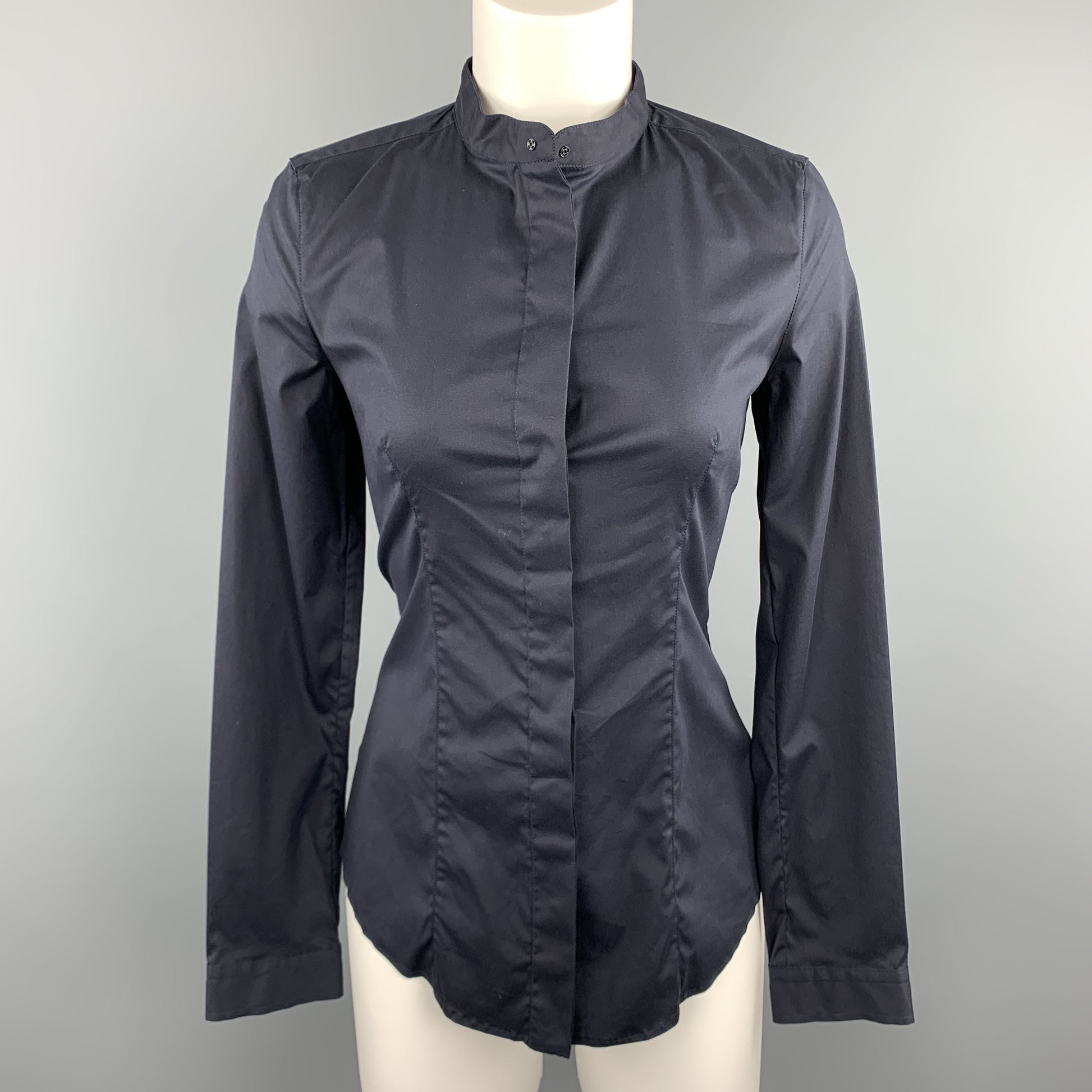PRADA Size 4 Navy Stretch Cotton Band Collar Shirt