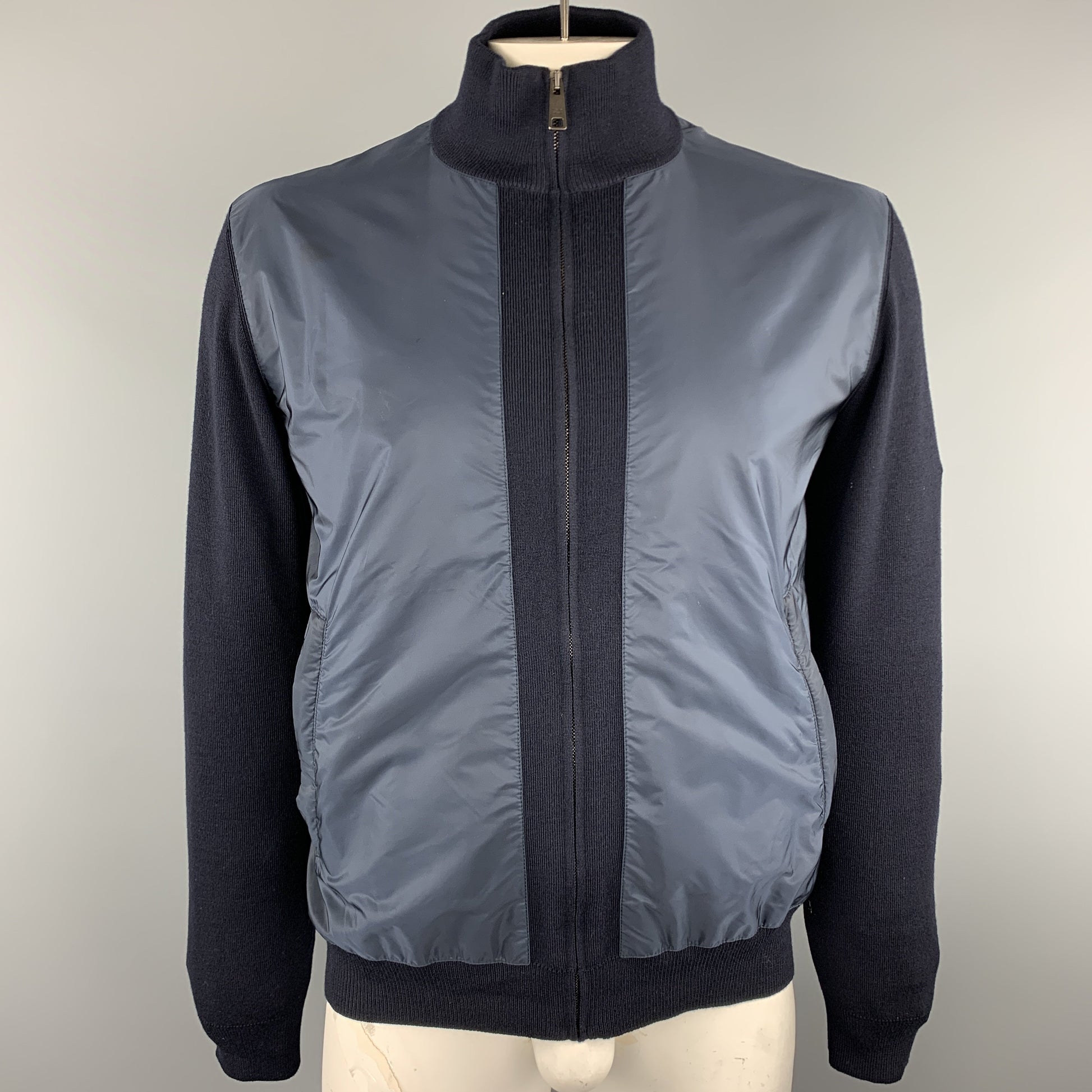 PRADA jacket comes in navy marino wool knit with a high collar, zip front, and nylon panels. Wear throughout. As-is. Made in Romania.