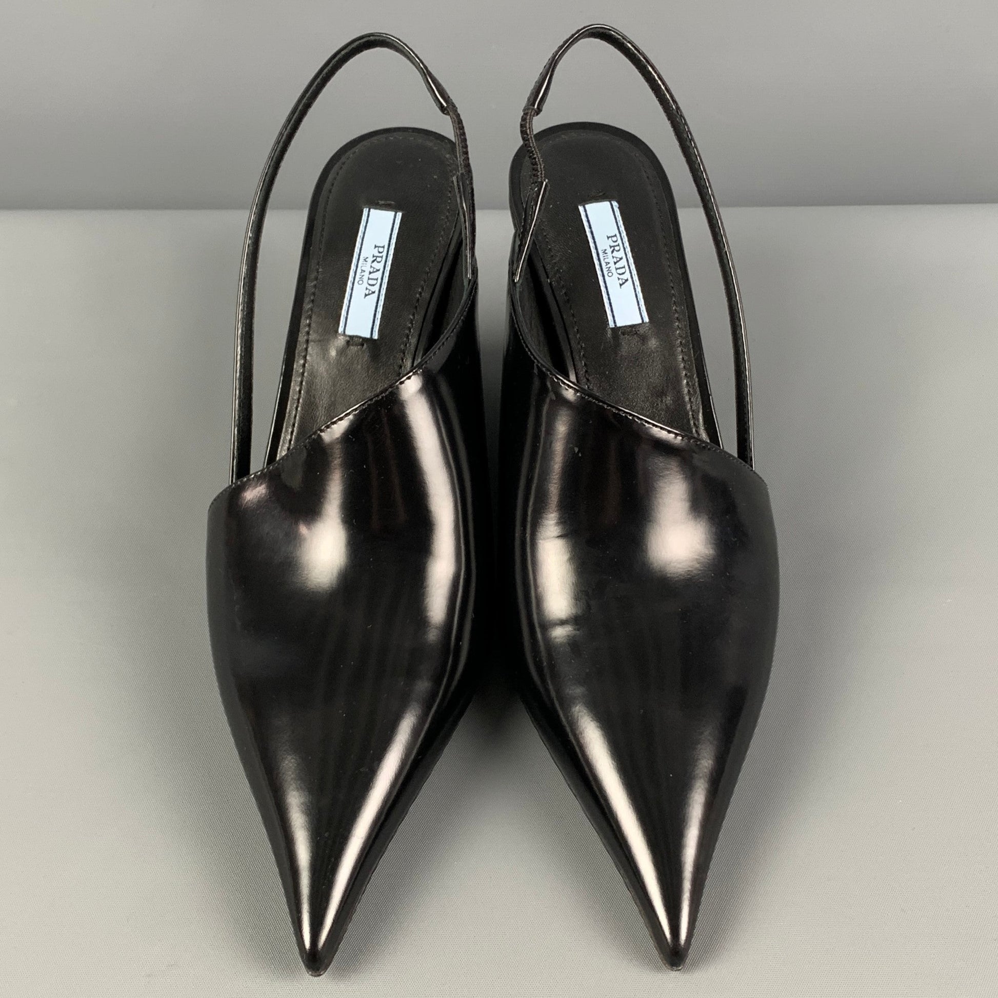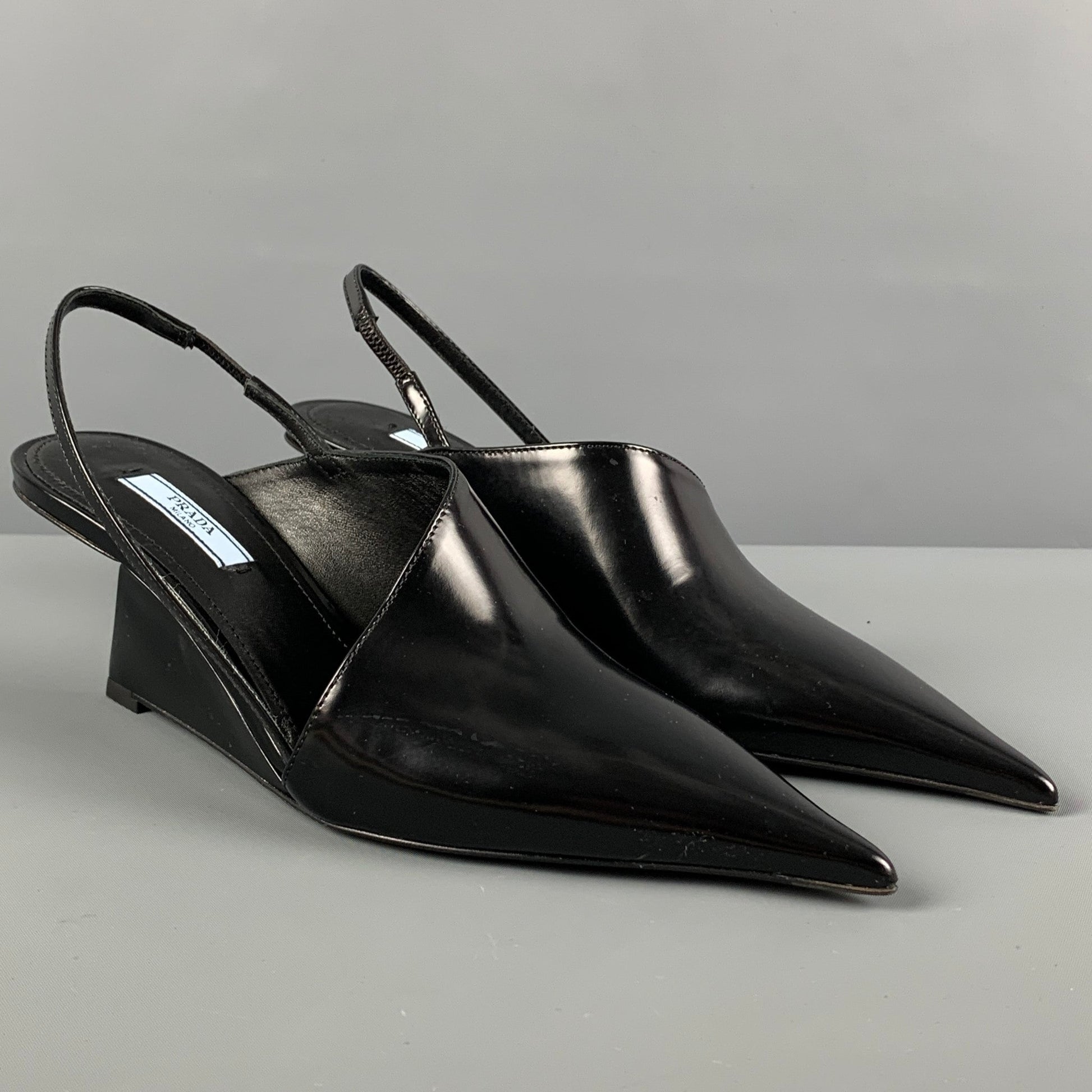 PRADA pumps comes in a black leather featuring a pointed toe, slingback detail, and a wedge heel. Made in Italy.