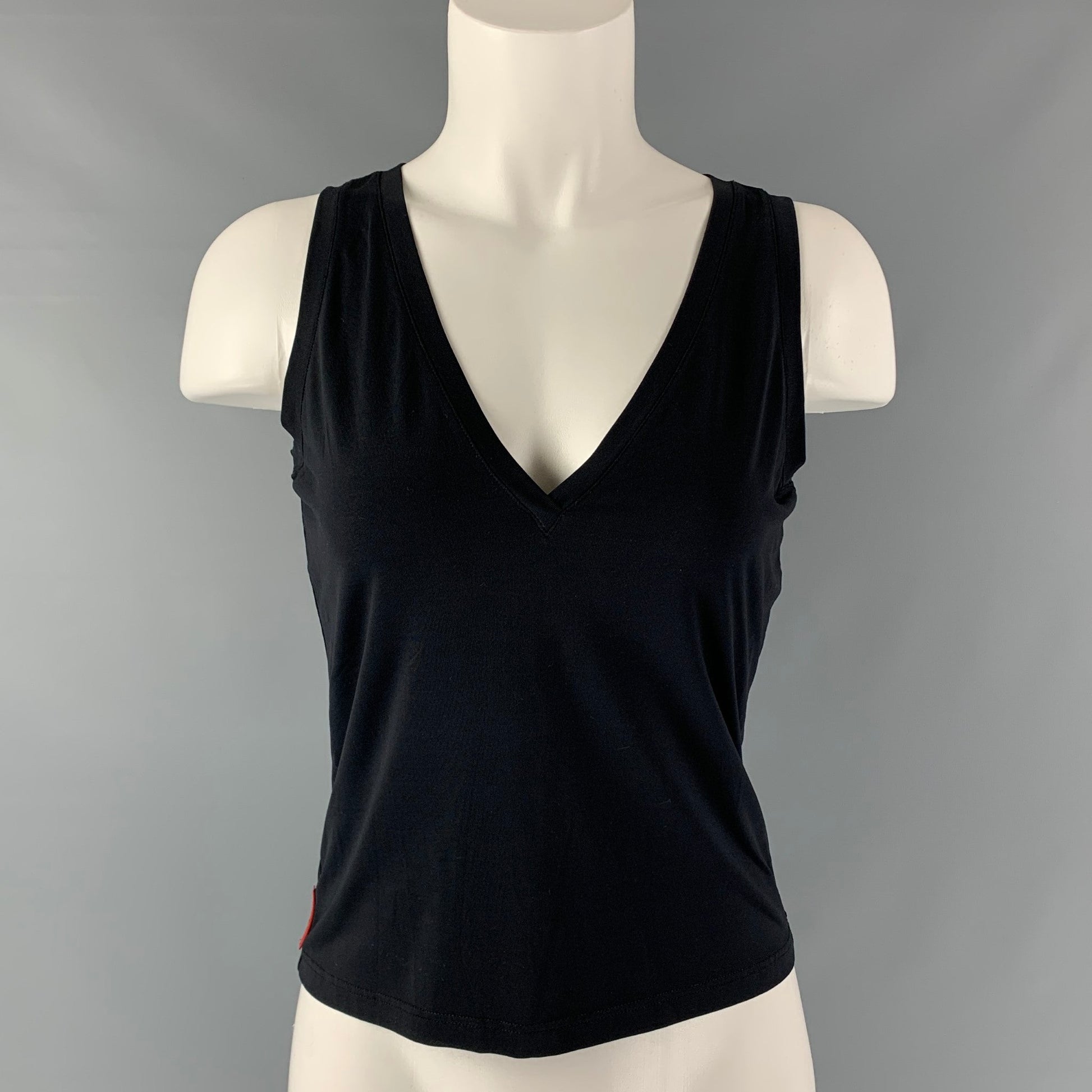 PRADA SPORT casual top comes in a black jersey knit fabric featuring a v-neck and a back zip up pocket. Made in Italy.