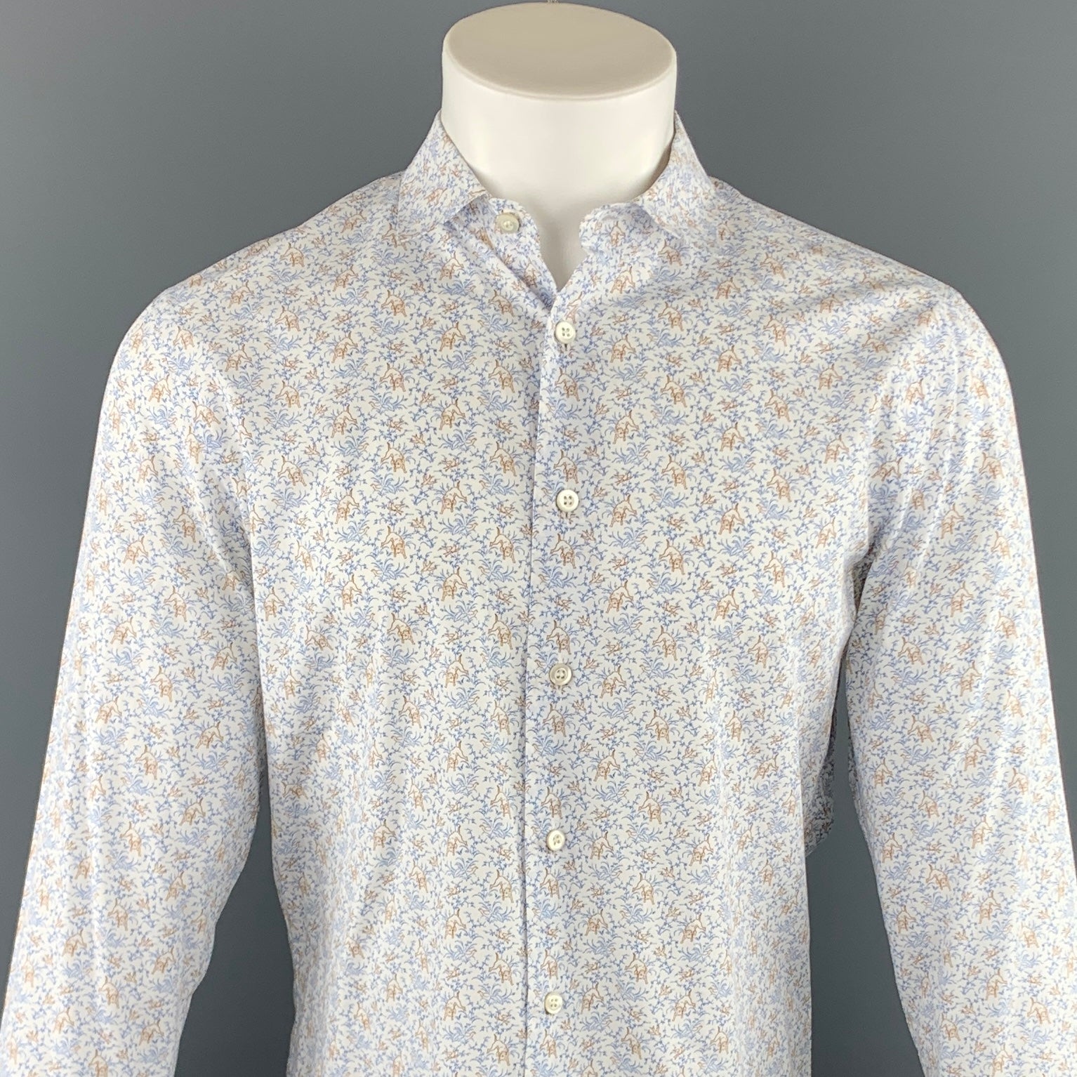 PRADA long sleeve shirt comes in a blue and brown cotton with a "Dogs & Bird" print featuring a button up style and a spread collar Made in Italy.
