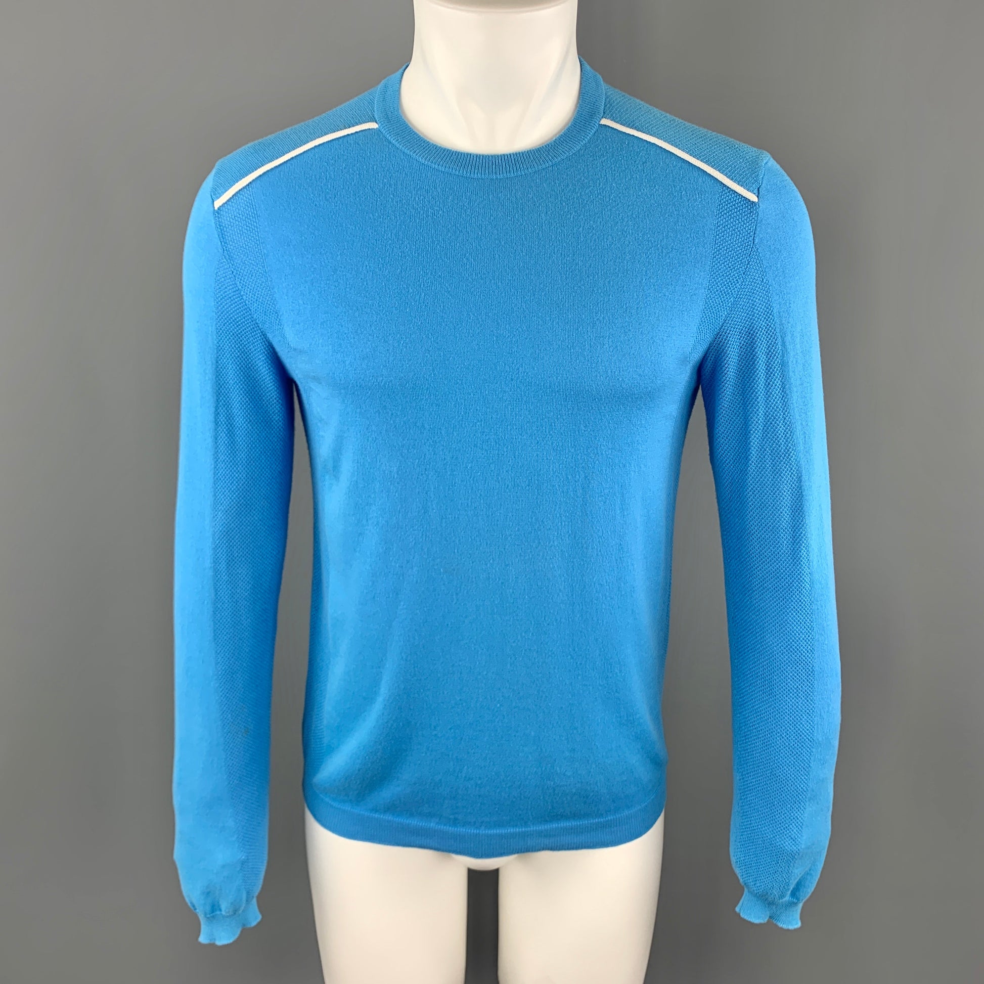PRADA Pullover sweater comes in an aqua knitted cotton material, with a crewneck, a white trim, textured pales, and ribbed cuffs and hem. As is, with wear throughout. Made in Italy.