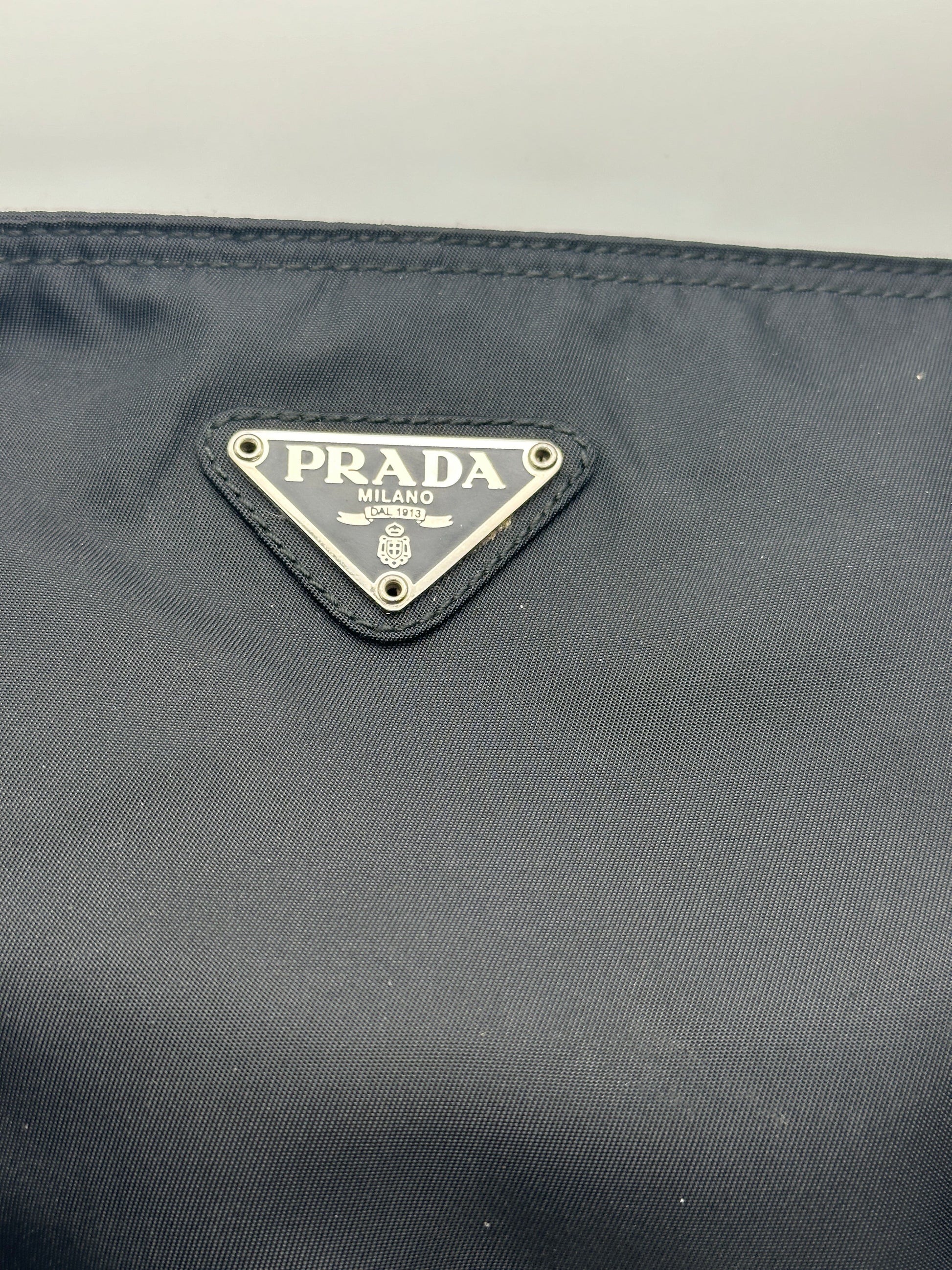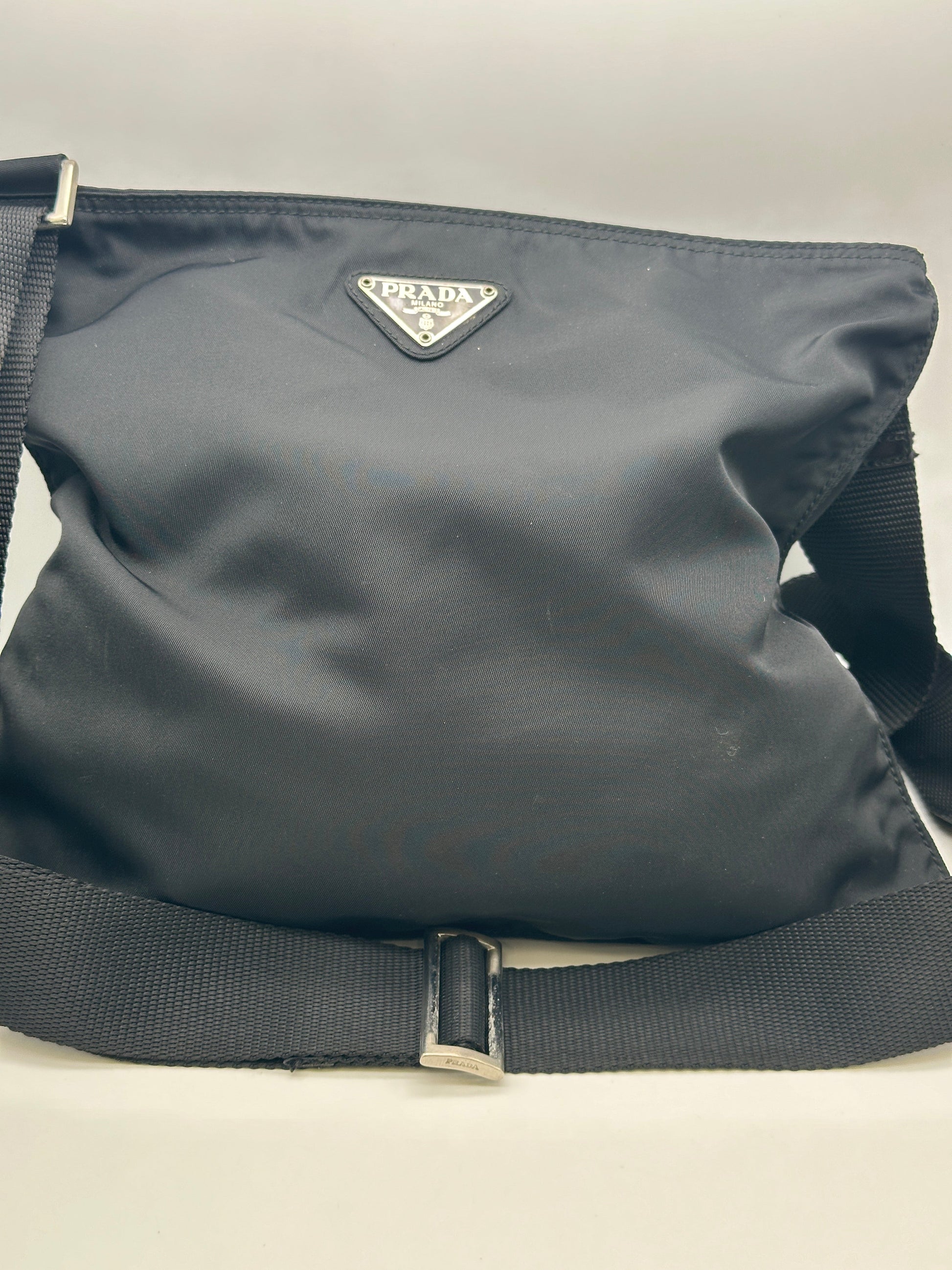 PRADA Tessuto Nylon Crossbody Bag in Black. This stylish messenger bag is crafted of fine tessuto nylon in black. The shoulder bag features a long adjustable shoulder strap, a front zipper pocket, and polished silver hardware. The top zipper opens to a black fabric interior.