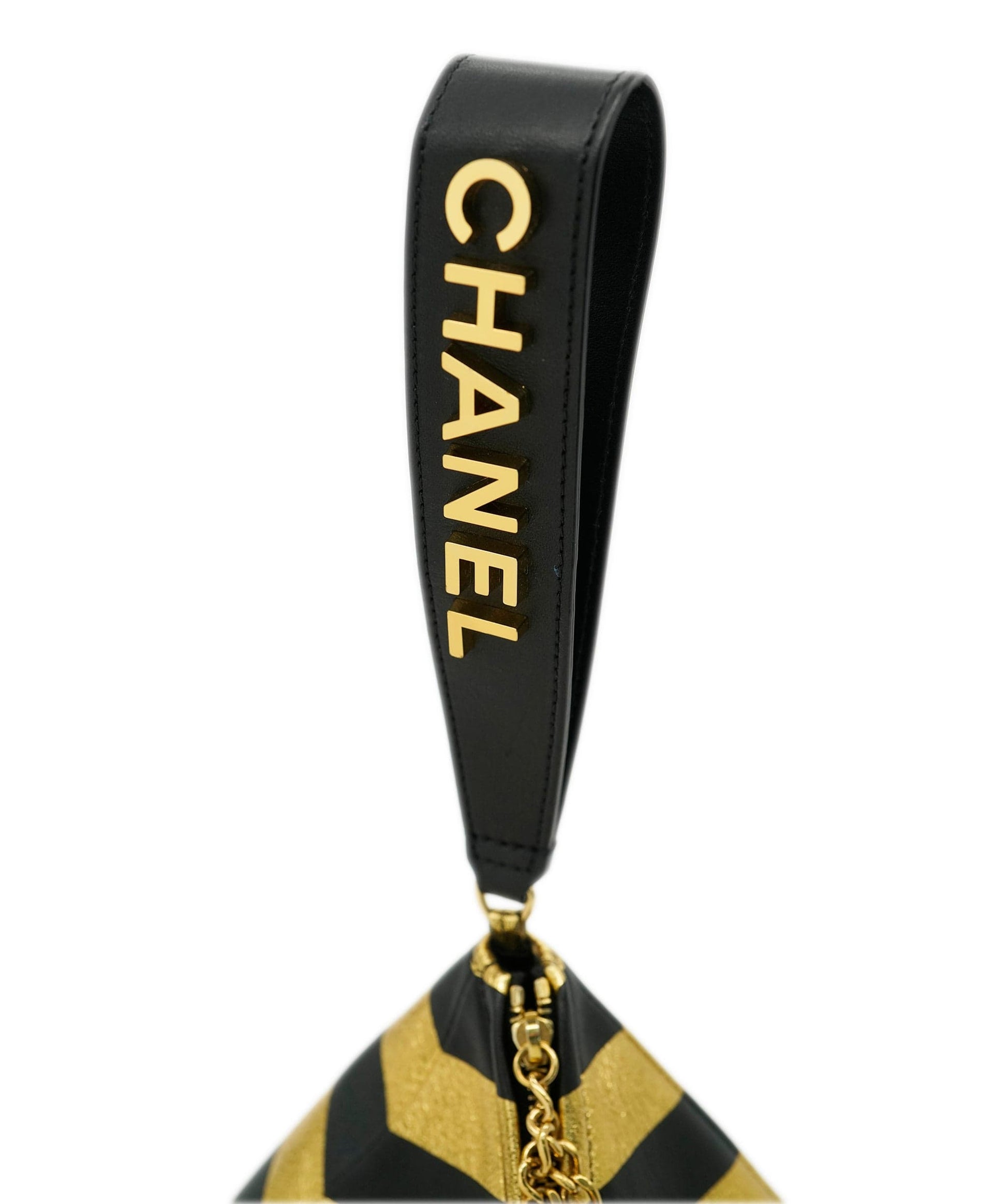 *RARE* CHANEL 2019 METIER D'ART BLACK & GOLD STRIPE LAMBSKIN LEATHER PYRAMID BAG WITH LOGO WRIST STRAP AND GOLD HARDWARE