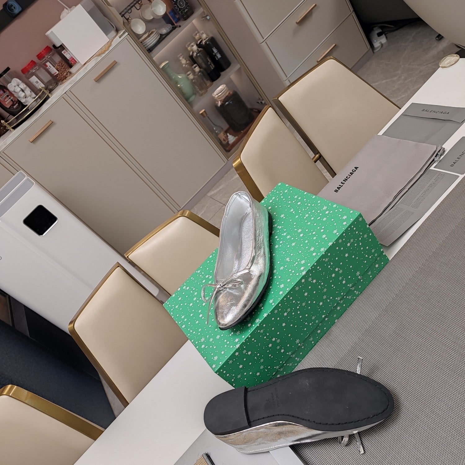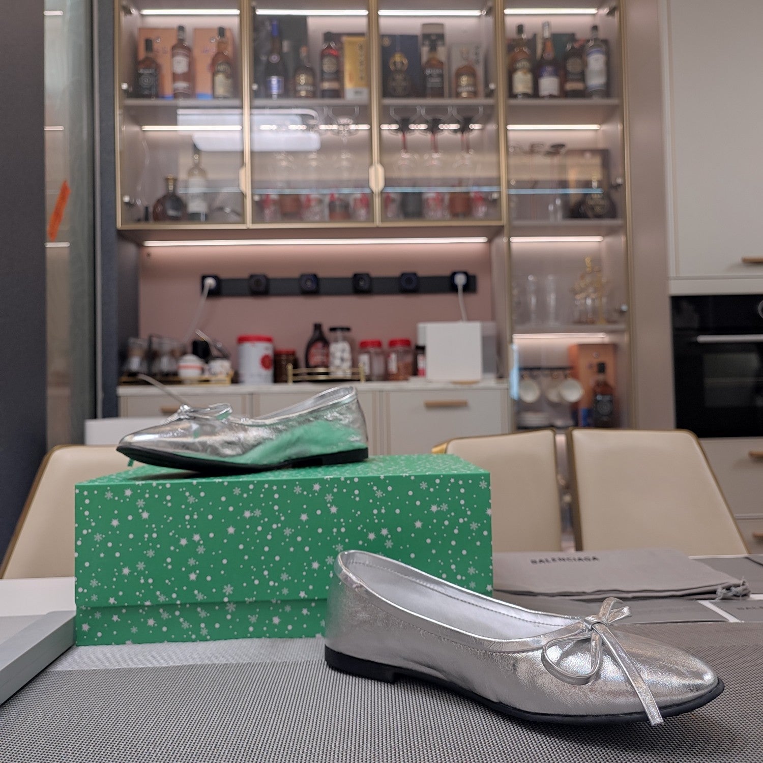 Balanciaga RHINESTONE BALLET FLATS WITH BOW IN SILVER WAX-OIL SHEEPSKIN