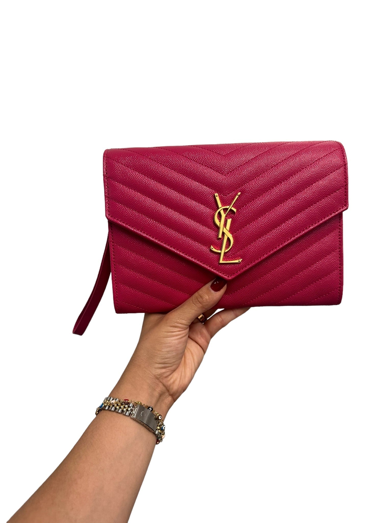 Experience luxury at its finest with the SAINT LAURENT Grain De Poudre Chevron Pouch Clutch. Adorned with golden toned hardware, this sleek clutch adds a touch of elegance to any outfit. Effortlessly elevate your style and make a lasting impression with every use.