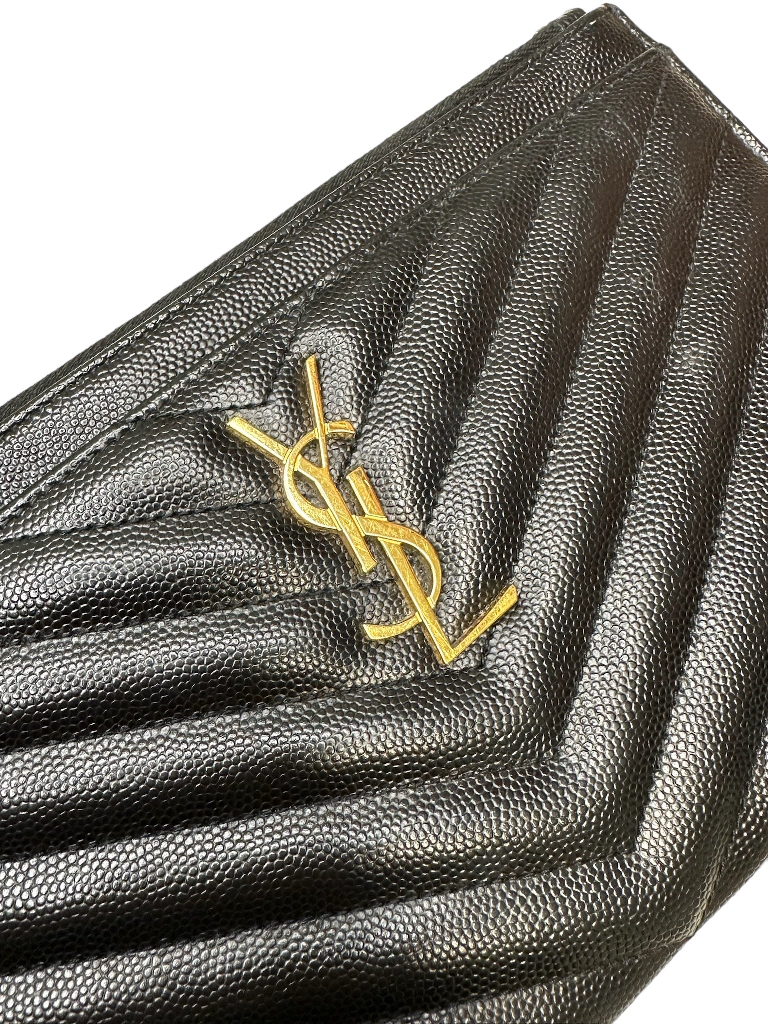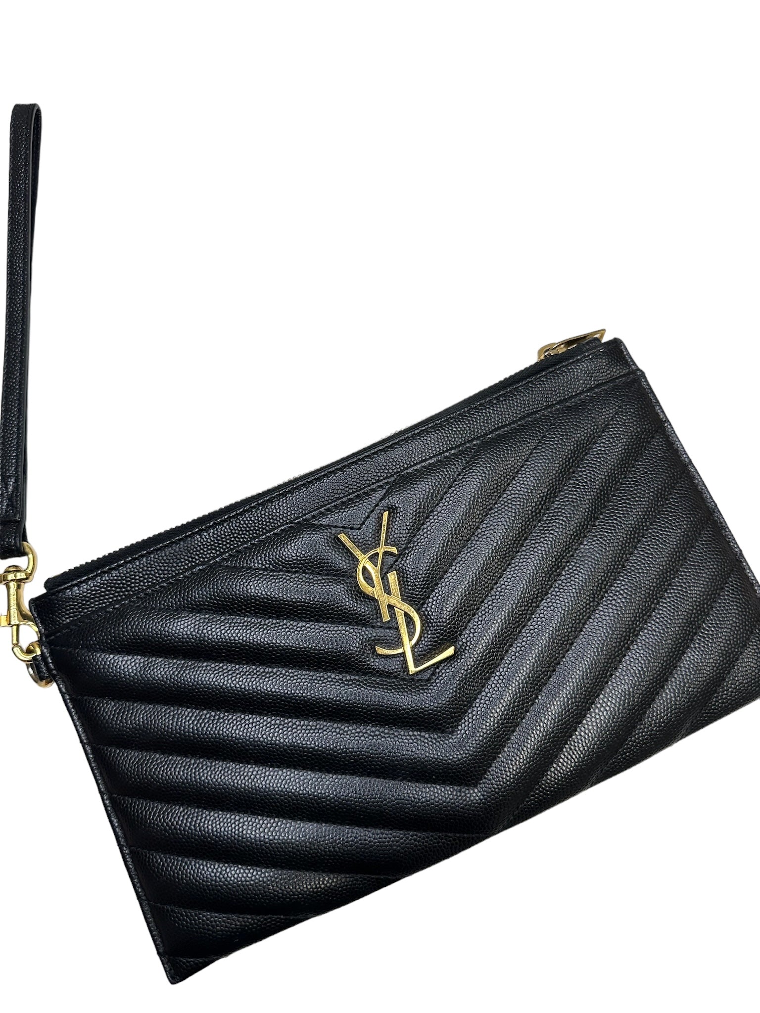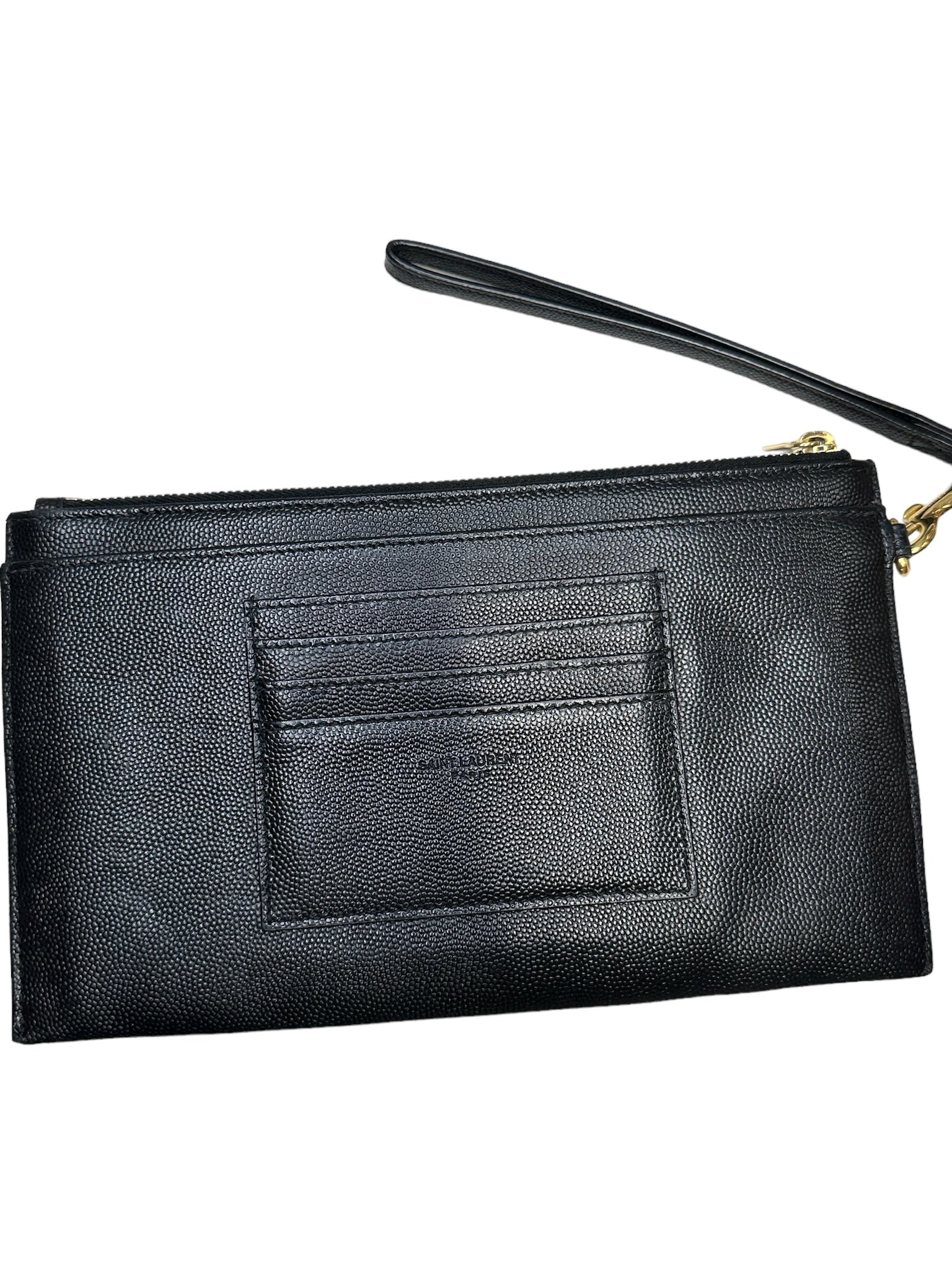 Elevate your style with the SAINT LAURENT - Black Grain De Poudre Bill Pouch. Adorned with golden toned hardware, this sleek pouch adds a touch of luxury to any outfit. Perfect for keeping your essentials organized and easily accessible, it's the ultimate accessory for the sophisticated and stylish individual. Make a statement and indulge in the finer things with this must-have pouch.