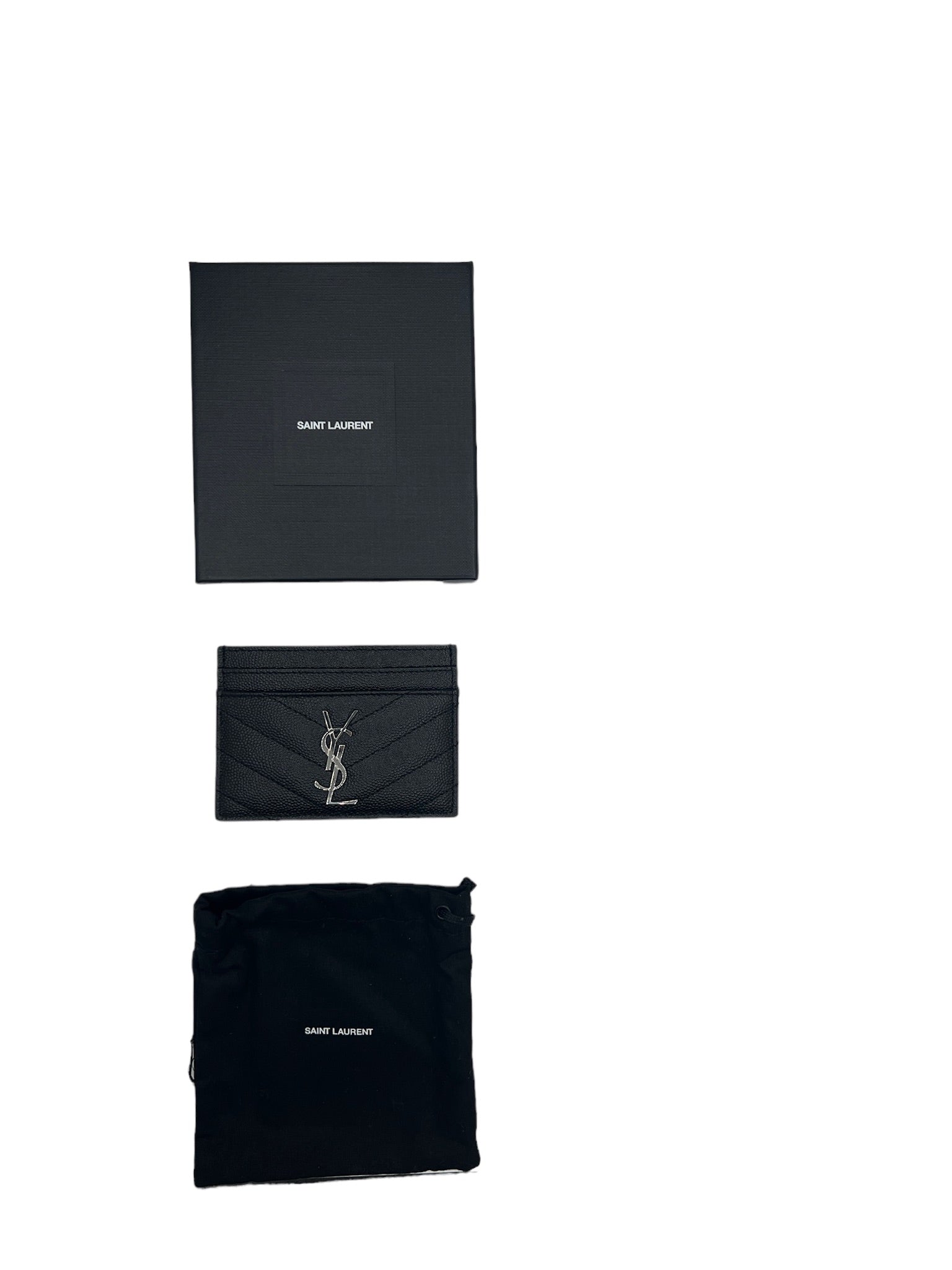 Included with your purchase is both a box and dustbag to help keep your item safe from damage when not in use. The sleek design of this SAINT LAURENT Black Grain De Poudre Chevron Monogram Credit Card Case makes it an ideal choice for those who want to keep their essentials organized without sacrificing style.