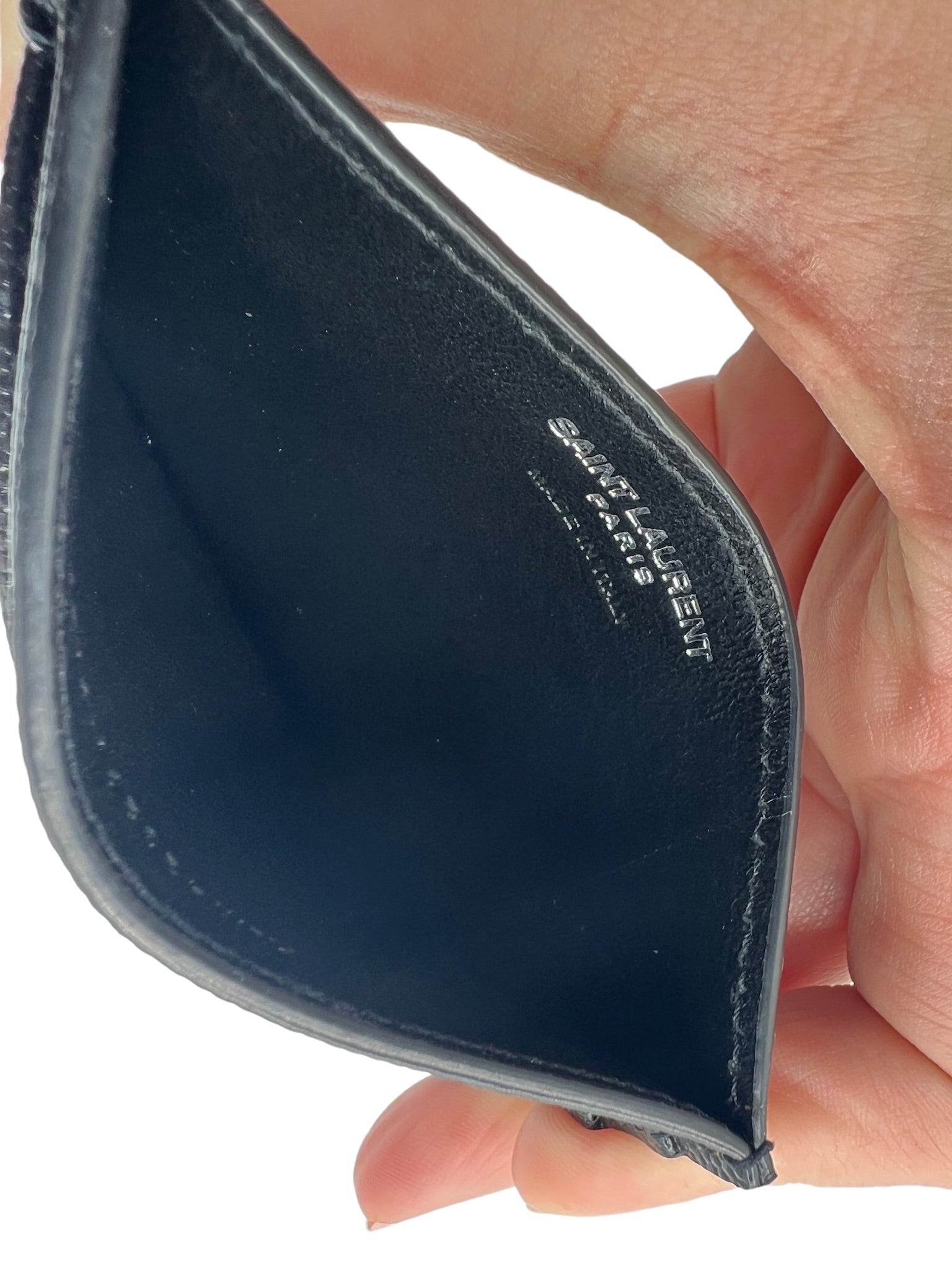 This SAINT LAURENT credit card case is the perfect accessory for carrying your essentials in style. Crafted from black leather and adorned with a Chevron Monogram pattern, this small leather good is the ideal size for slipping into your pocket or handbag.