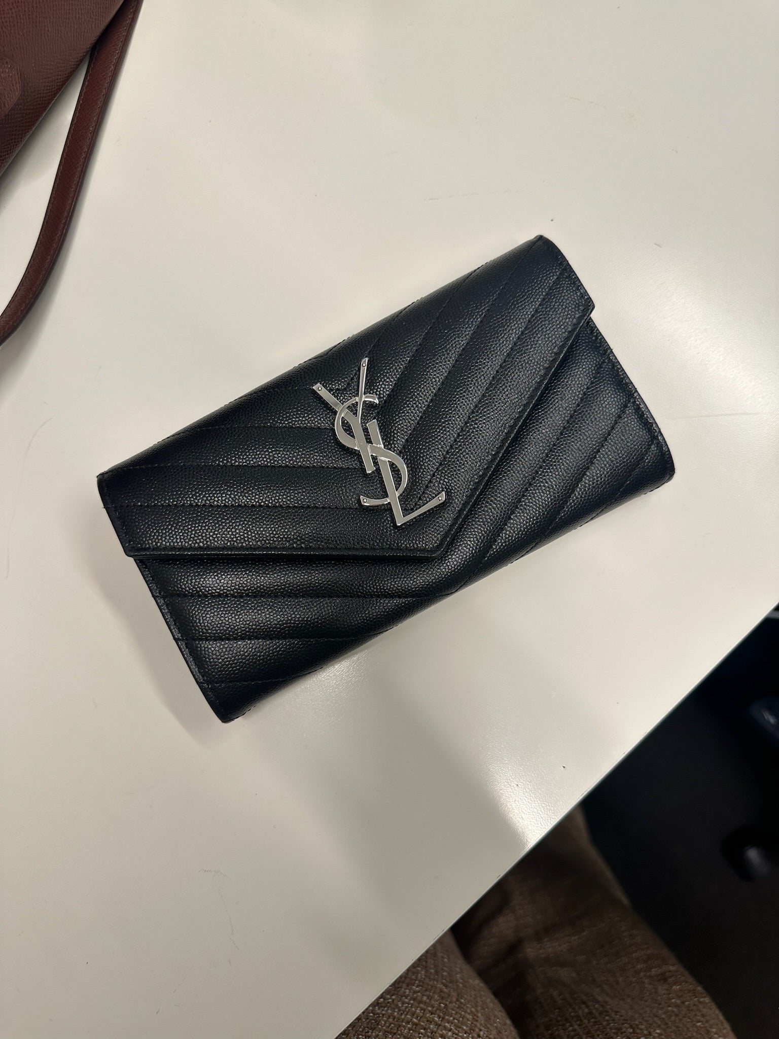 Experience luxury with the SAINT LAURENT Black Grain De Poudre Matelasse Cassandre Large Flap Wallet. Featuring silver hardware, this wallet is not only elegant but also functional with plenty of space for your essentials. Elevate your style and indulge in the sophistication of this timeless accessory.