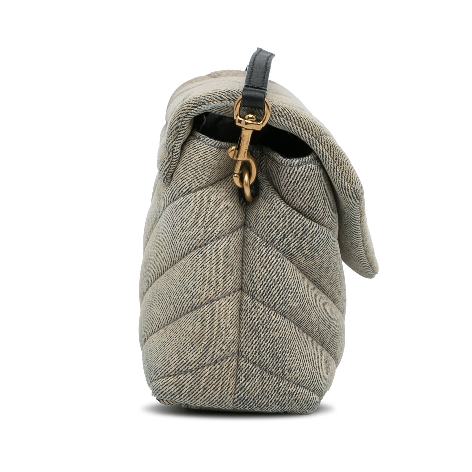 This SAINT LAURENT Denim Toy Loulou Crossbody is a must-have for anyone who loves both style and practicality. With a beautiful grey denim fabrication and a crossbody bag silhouette, this bag is perfect for daily use. The front flap with magnetic snap closure keeps your belongings secure, while the interior zip and slip pockets keep your essentials organized.