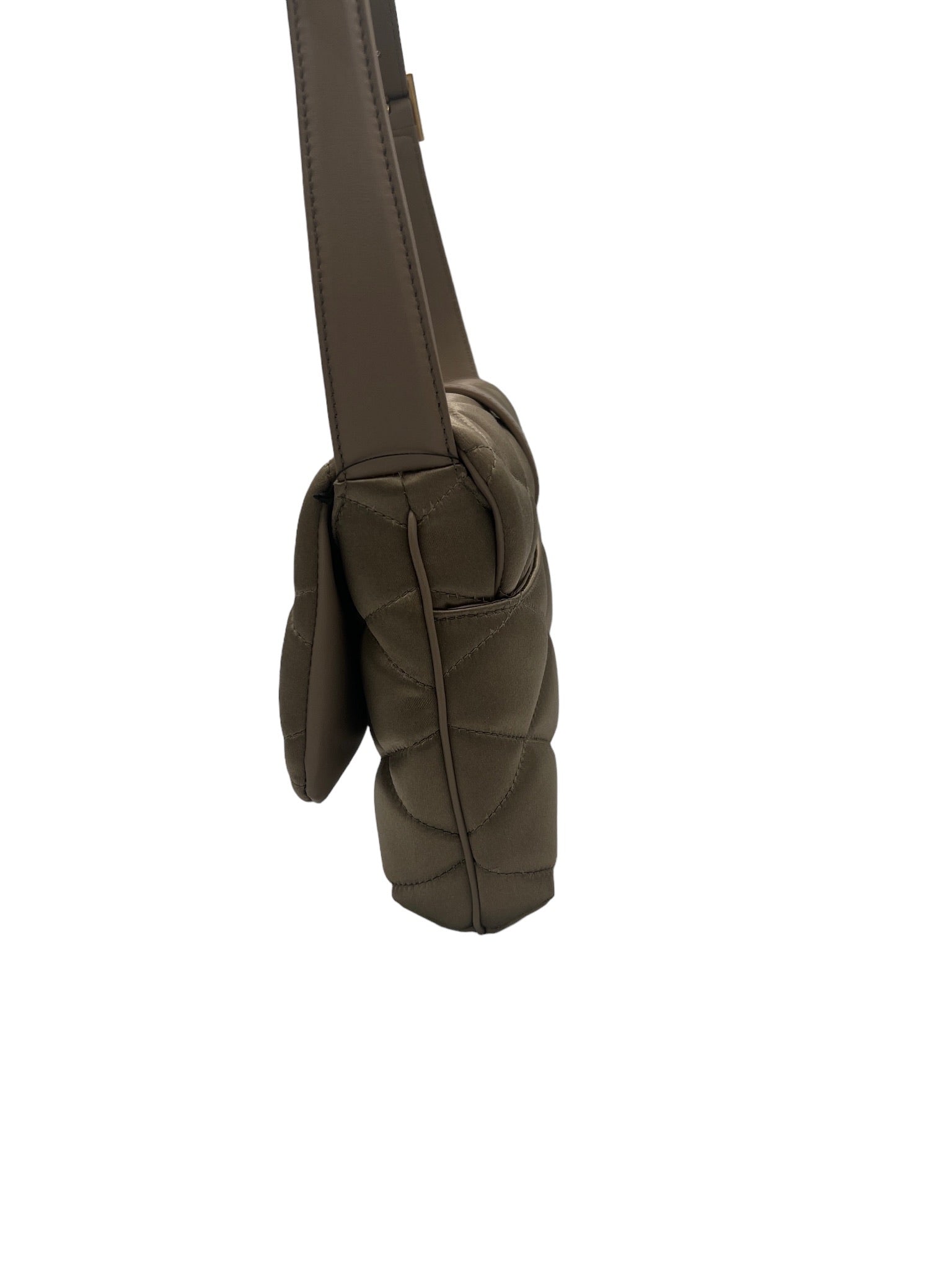 Crafted in Italy, this elegant shoulder bag features carré-quilted satin adorned with leather trim and lined with luxurious suede.